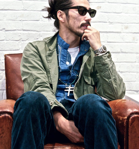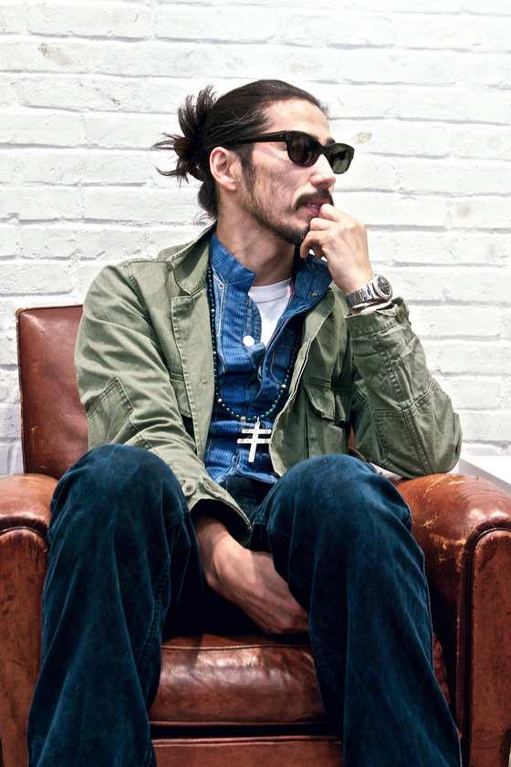 Want something casual, but hate business casual? Mid-blue chambray and denim shirts have been cornerstones of classic American sportswear forever. For a simple, casual look, they can be worn on their own with chinos or jeans in a way that’ll look better than your standard poplins or even oxford cloths (pair one with a chunky shawl collar cardigan, like you see below, once the weather turns cold). A dark blue shirt can be worn with lighter blue French chore coats and old blue jeans, creating a tonal outfit. I also like how Visvim designer Hiroki Nakamura wears his above with a white t-shirt and olive field jacket. If you get something in a heavier, thicker material, you can also use it a mid-layer.