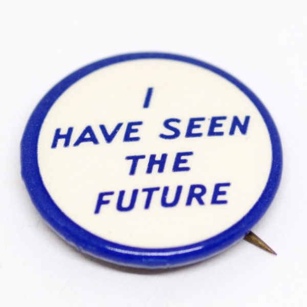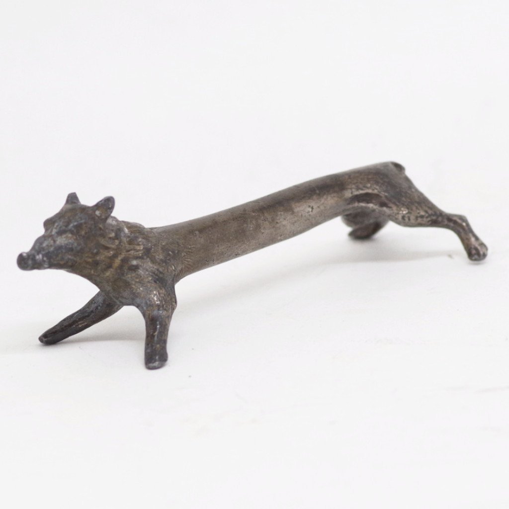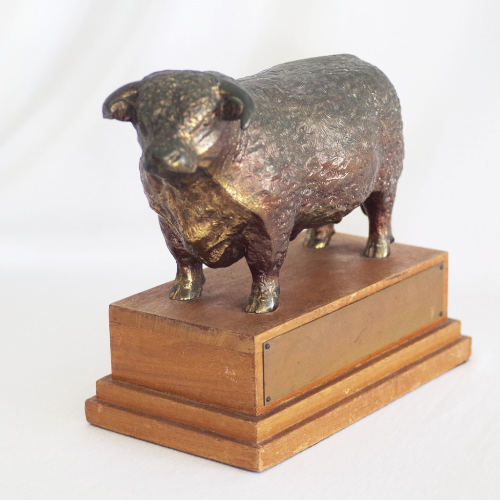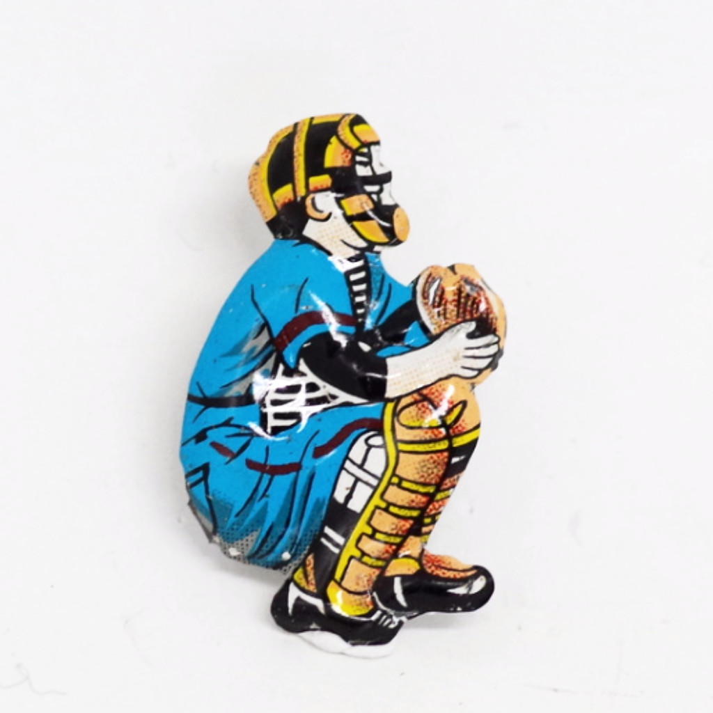 Above: a pre-War Japanese oxford shoe pincushion (perfect for stickpins, or display on its own). A silver-plated boar knife rest from Victorian times. A spectacular pair of elephantine bookends. A pair of Lennon-esque eyeglasses that were already old when Lennon got his. A pair of tiny salesman sample Florsheim shoes. An adjustable biker ring. A chrome hippopotamus. A truly grand bronze bull trophy (unengraved). A tiny baseball catcher from the 40s or so. A pin from the “Futurama” exhibition at the 1940 World’s Fair. And that’s just the tip of the iceberg.