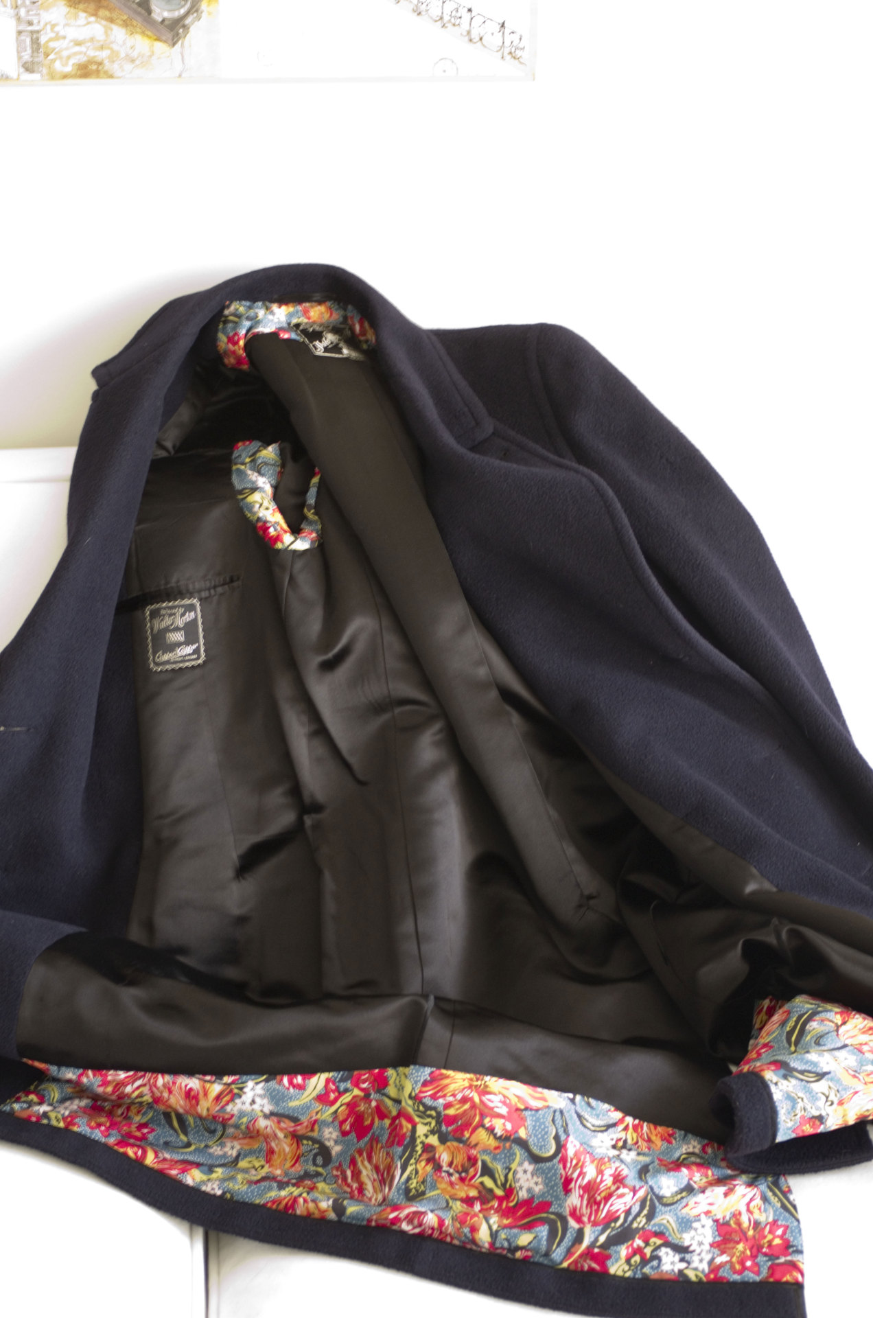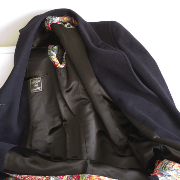 Above: the result. Rather than replacing the lining, we patched it with fabric leftover from Put This On pocket squares. We were careful to preserve the tags, too – those old tags are one of the best parts of a vintage garment. The result is a very serious and hard-working coat on the exterior, with a beautiful secret inside.