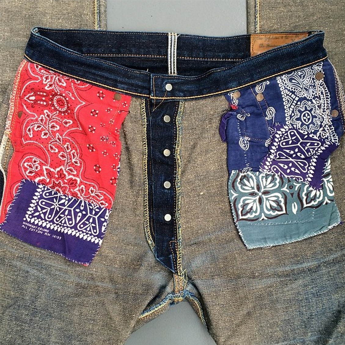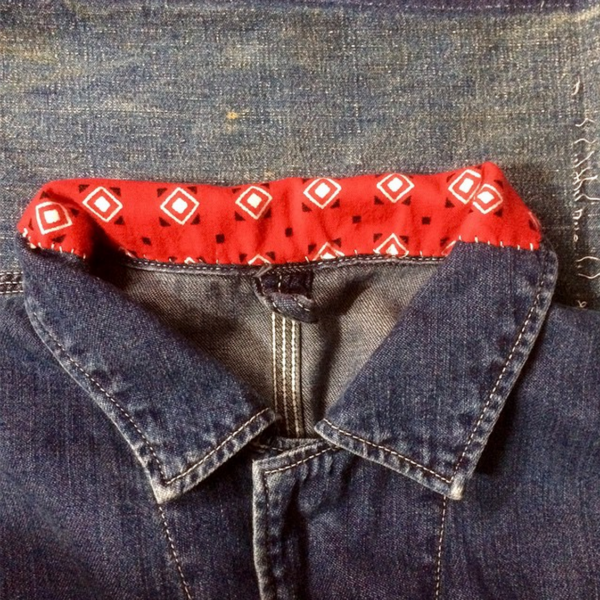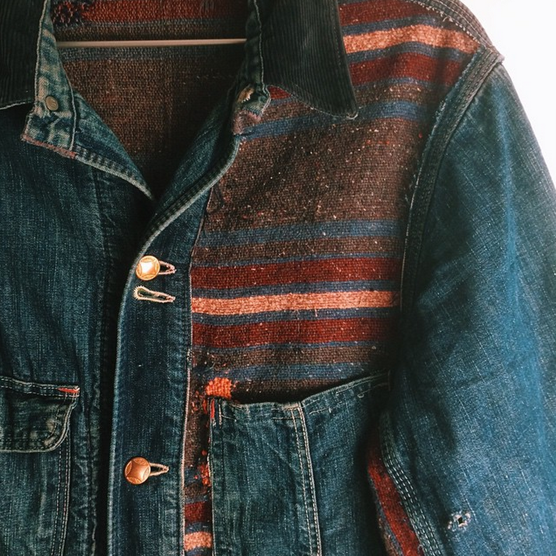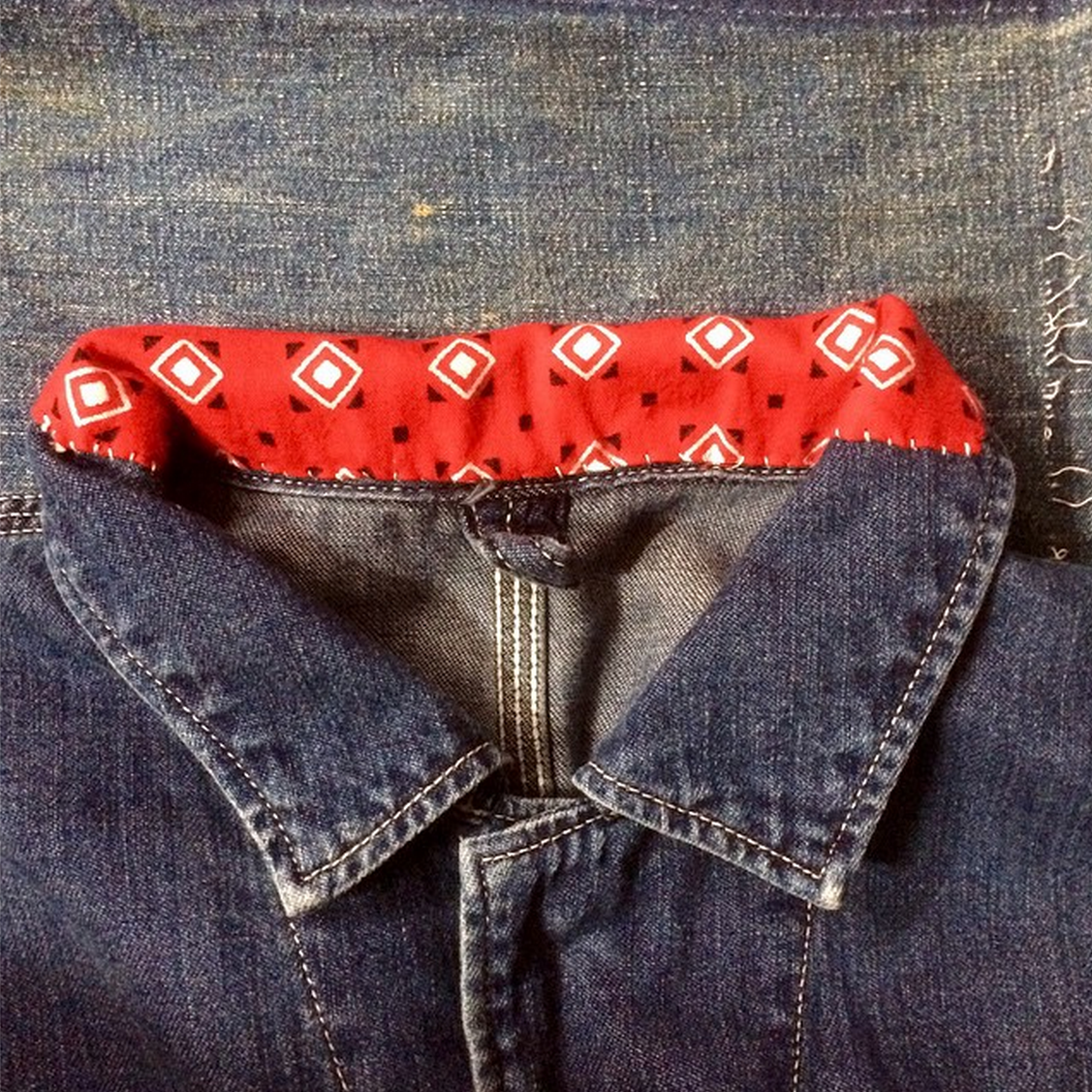 Seen above are some of the creative ways he’s repaired his vintage finds. There’s a pair of jeans with pocket bags made from cut-up bandannas; a dirty collar of a denim shirt made new again through some more bandanna cloth; an old Five Brothers flannel with a slightly askew internal pocket (made with just the right amount of pattern matching); a denim jacket with blanket lining on the outside of the coat; and finally, some decorative sashiko stitching on the collar of an old chambray shirt.