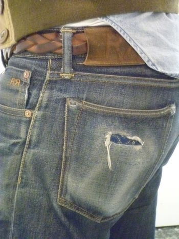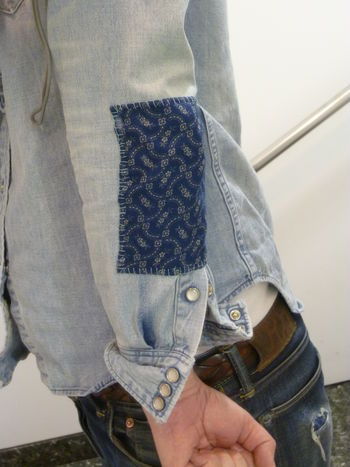 Anyway, Ghost01 had an RRL shirt and a pair of jeans that were falling apart. The elbow on the shirt had worn through and there was a hole in the back pocket of the jeans from where his wallet is usually kept. His solution? Patch up both holes, at home using his own sewing skills, with an old RRL pocket square that he had laying around. I think the results look pretty great – a practical solution that’s also in keeping with RRL’s aesthetic.
