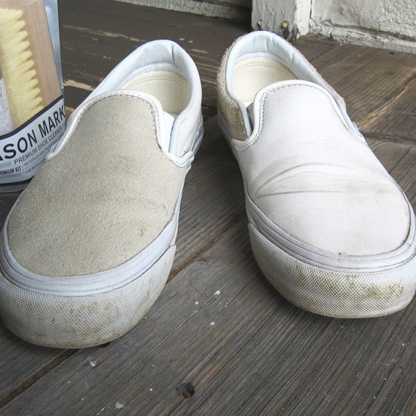 This past weekend, I tried Jason Markk’s Premium Shoe Cleaner, which is popular among sneakerheads. The kit is simple: there’s a 4oz bottle of cleaning solution and a stiff bristle brush. You dip the brush in water, apply the solution, and scrub away. The combination is surprisingly effective, and the solution is said to be safe on any material (leather, suede, nubuck, canvas, etc). It does take a couple of rounds of cleaning to get things back to like-new conditions, however, and I found that a little elbow grease is needed on the textured sides of rubber soles.