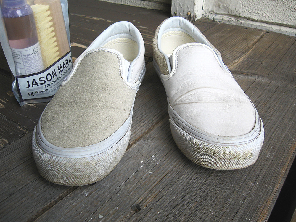 (Pictured above: My Engineered Garments x Vans slip-ons, before and after a cleaning. For more examples of people cleaning with a Jason Markk kit, you can check out videos posted on YouTube)