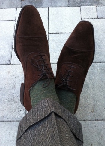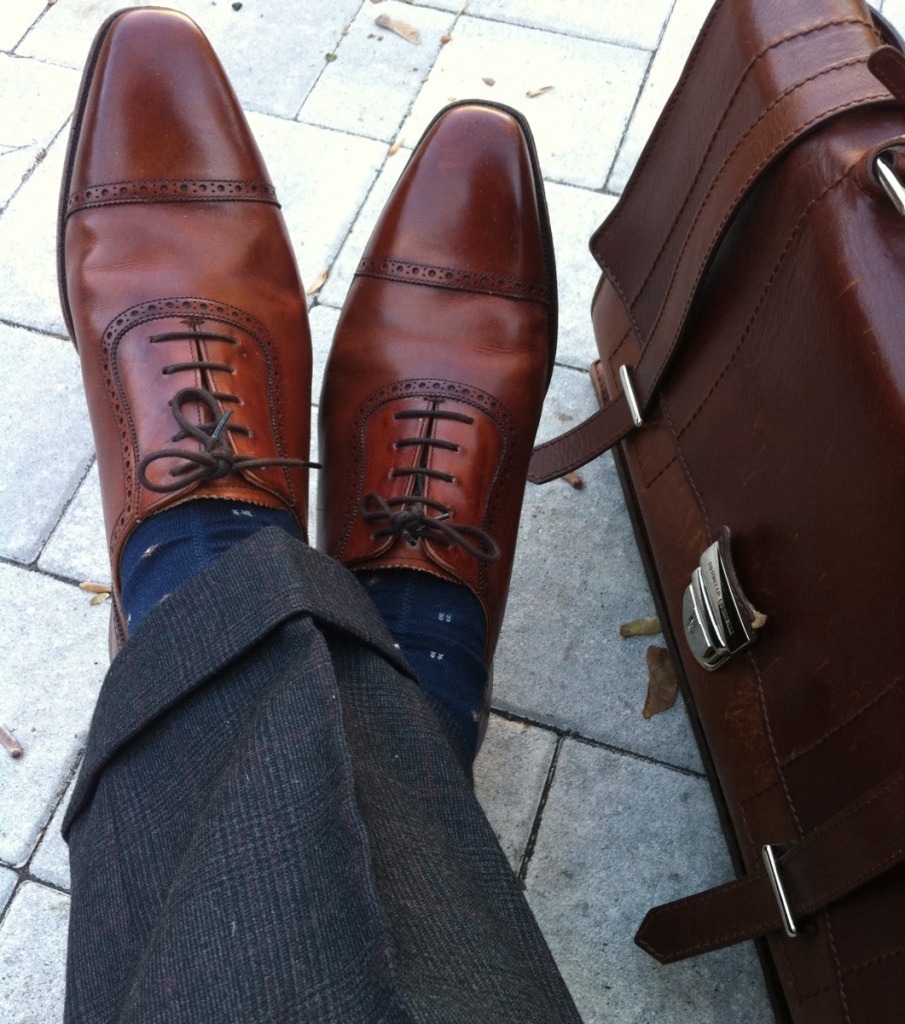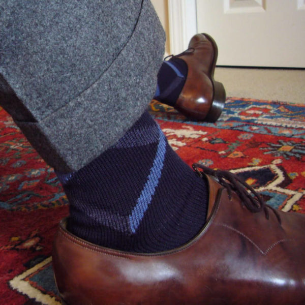 In the end, I’ve found that navy socks go with everything. It’s richer than black and complements any color next to it. Thus, most of my socks are a solid navy, with charcoal a close second. I also have a few pairs in odd colors such as dark bottle green and aubergine, which I wear whenever I want a bit of irreverence. Those are never worn to match trousers, of course, though sometimes they complement a secondary color in my tie.