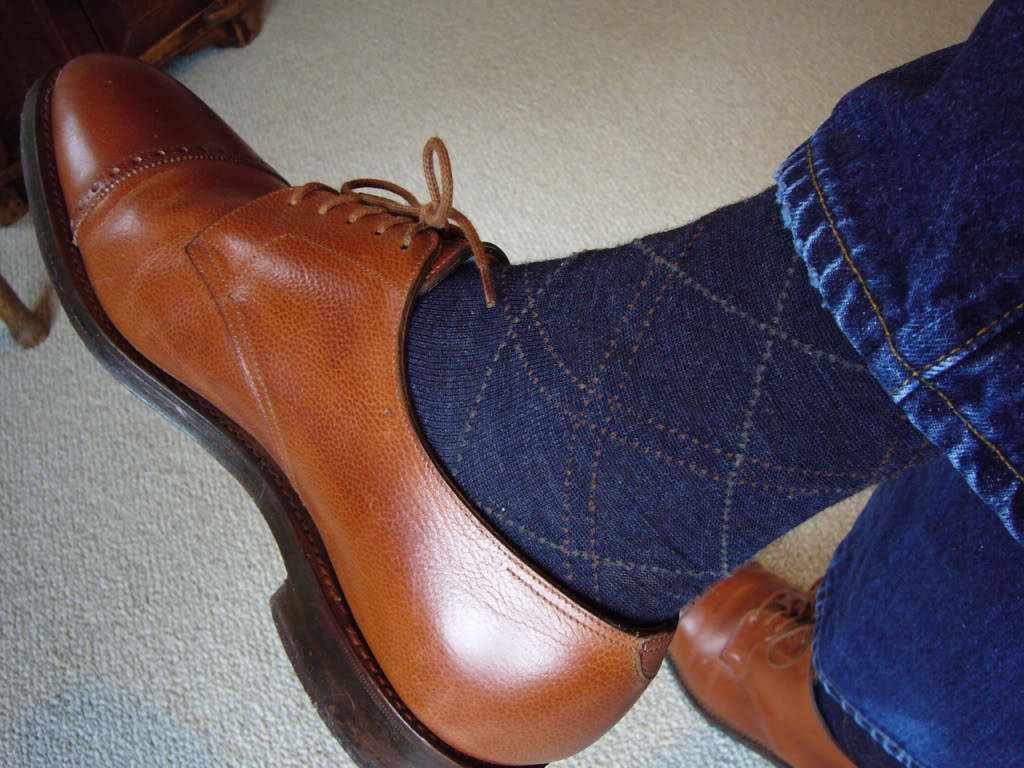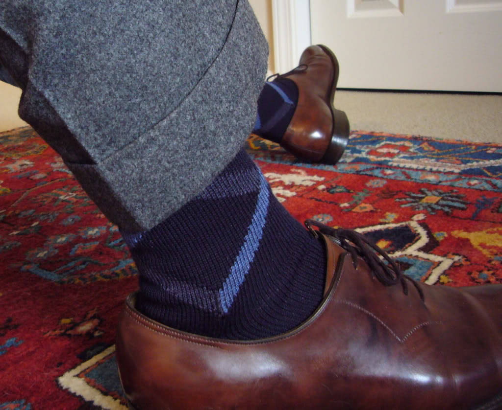 There’s an old piece of wisdom that says men should match their socks to their trousers. Doing so elongates the leg line, which in turn supposedly makes the man look taller. I’ve never been quite sure of this rule (or the logic). It works fine for navy or charcoal trousers, but matching brown socks to similarly colored pants and shoes seems off to me. I also don’t care for light colored socks, so wheat and mid-grey trousers need a different colored hose.