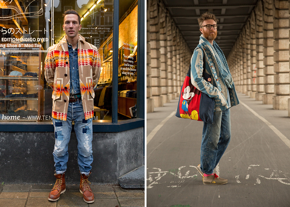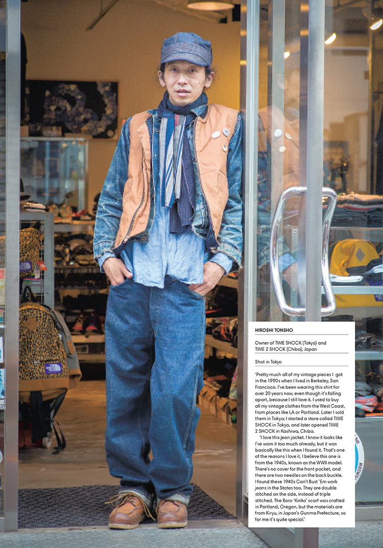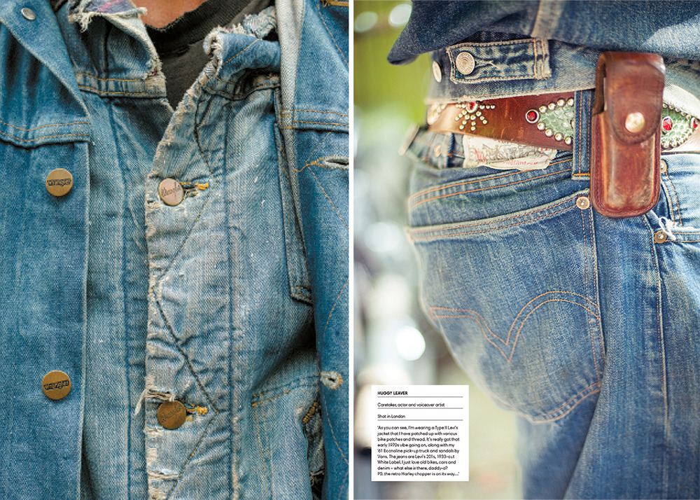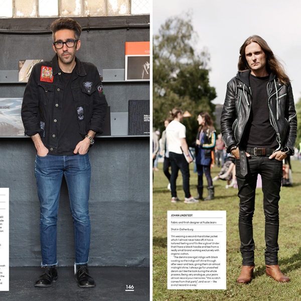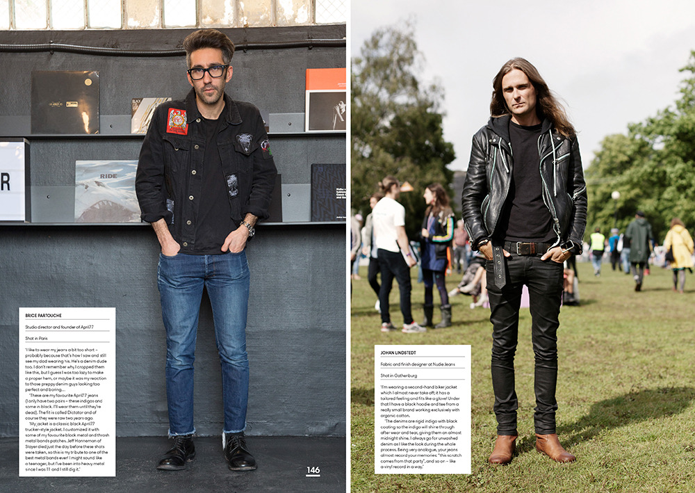Most of the book features the kind of looks you’d expect – beat-up jeans with chambray shirts and work jackets – but there’s also an appreciable level of diversity. Nudie designer Johan Lindstedt and April77 founder Brice Partouche can be seen above wearing a more rock-and-roll look (black jackets with plain hem jeans), while the head of Levi’s Vintage Clothing, Miles Johnson, is shown wearing something a little more eccentric. (Johnson’s jeans are an original pair of Levi’s 501s from the 1950s, which he found brand new and unworn. He gave them a friend who works in a plastics factory, who then returned them after a year, beaten-up and worn-in. Johnson removed the spots of paint and plastic with some solvents and sandpaper, which is what gives them their look now).