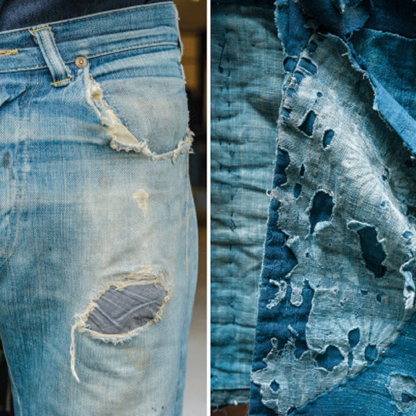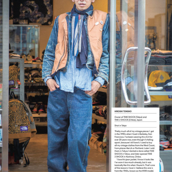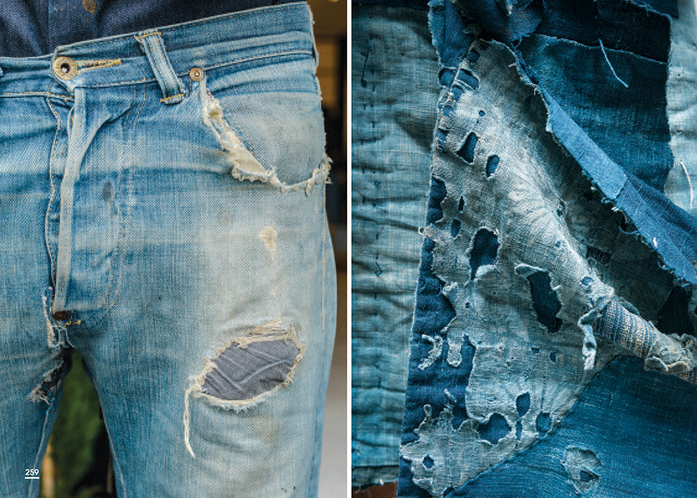 My favorite photos might be from the chapter on Japan – the country that started this vintage workwear revival. Here, you’ll see Kapital’s designer, Shunji Ohashi, wearing a patched-up apron he received from a worker at Kapital’s main factory. There are also some nice photos of Time Shock’s owner Hiroshi Tonsho, shown above wearing a boro scarf with some vintage clothes he’s picked up over the years. Both men exhibit the kind of wabi sabi look we’ve written about in the past.