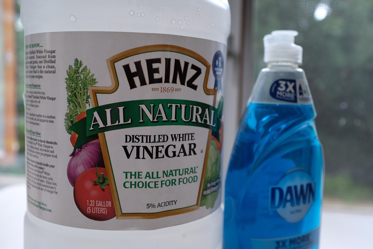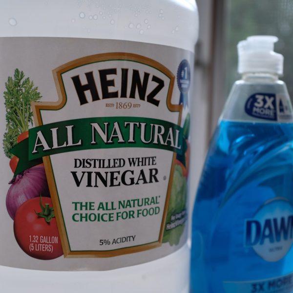 • For a normal load, add a half cup of white vinegar and a third cup of dish soap to the water (don’t need to be exact, we’re not making a souffle here). Add whatever detergent you’d normally add as well.