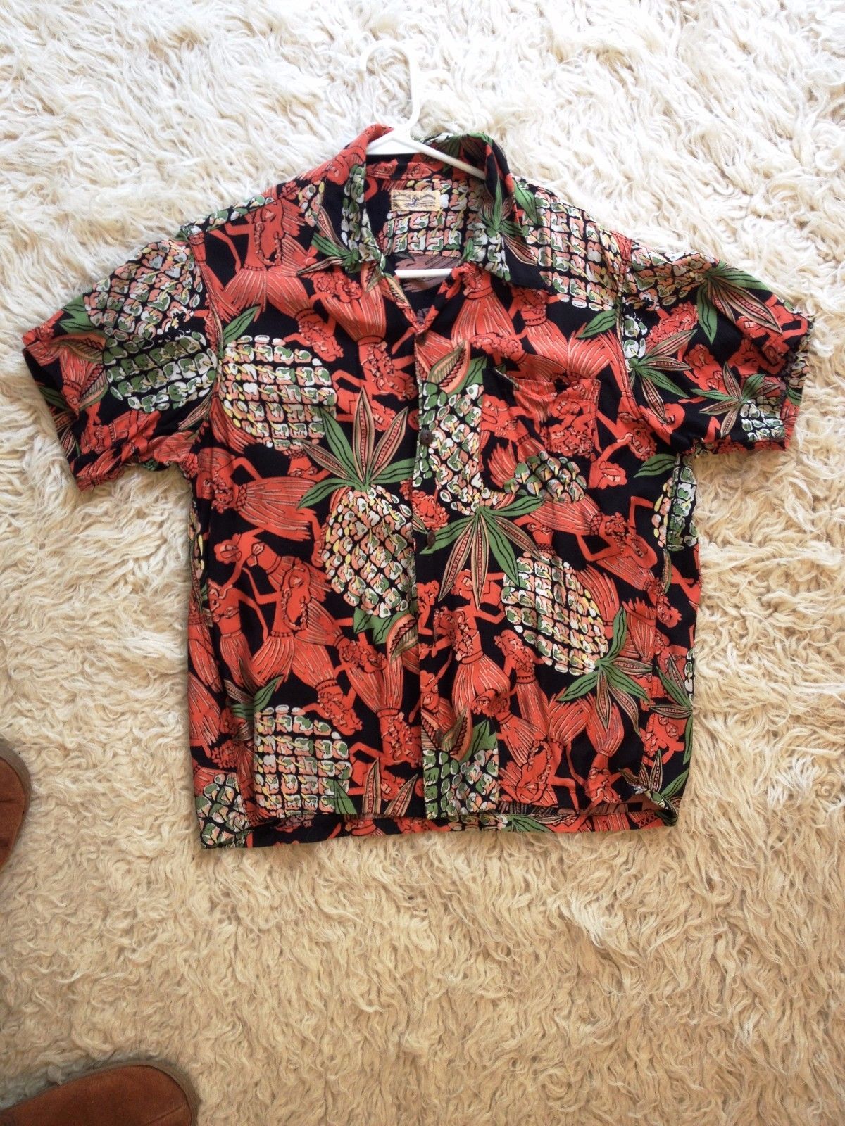 Some favorites today: a Christian Kimber pocket square inspired by the city of Hanoi, slubby Richard James tie, RRL cafe racer, and the red pineapple print Aloha shirt you see above, which is in this guy’s collection of vintage shirts.