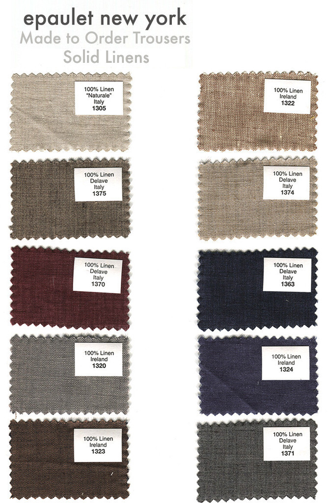 The swatchbooks here are impressive. There are just enough options to satisfy whatever you might want, but not so many that you feel lost in the choices. In linens alone, for example, there are five different shades of brown, all of which would be great for summer. Epaulet also has some tropical wools, which are often hard to find off-the-rack (tropical wool being a lightweight, breathable fabric that’s very useful for hot days). After selecting their fabrics, customers can choose some basic design details, such as how they want the waist to be styled (with belt loops, side tabs, or suspender buttons) and fly closed (zippered is easier to use, but buttons will help you avoid fly tents).