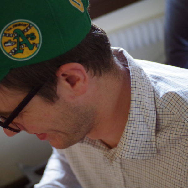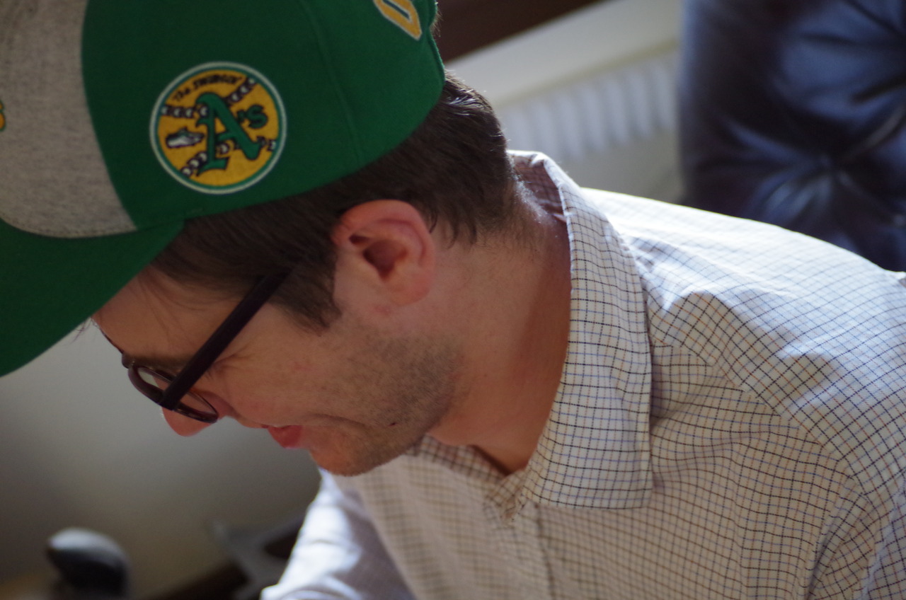 Had a great meeting today with our director Benjamin Harrison. He always travels in a custom shirt and an A’s hat.
