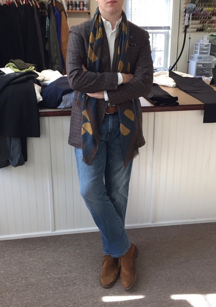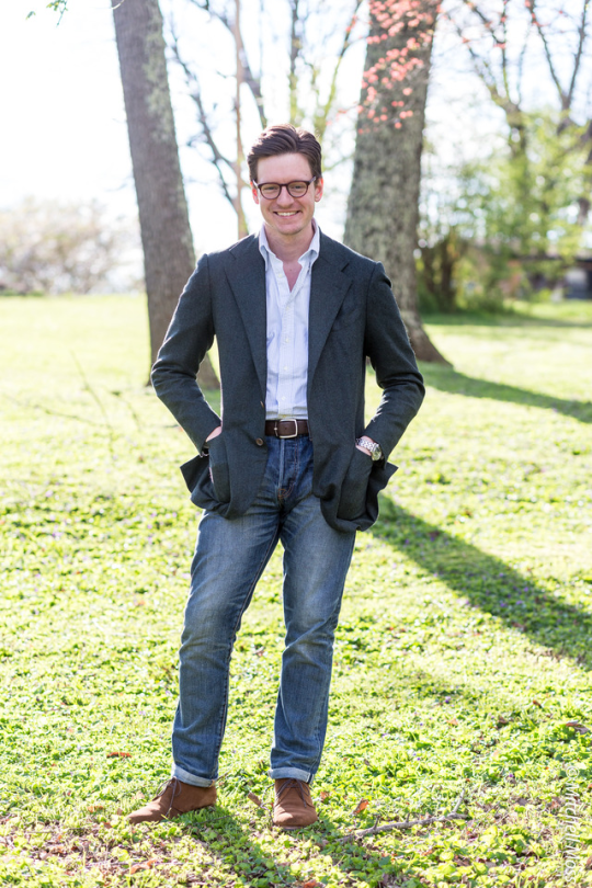 - Use the Right Sport Coat: If you want to wear a traditional sport coat, find one where you don’t have to bridge such a big divide in terms of formality. In other words, find a jacket that’s inherently casual. Very textured jackets, especially ones with a rustic sensibility, are good choices. So, think tweeds, corduroys, and linens. They have a casual, rustic nature that plays well with the workwear sensibility of denim. Certain cuts also work better – shorter jackets, rounder sleeveheads, softer shoulders. If the jacket looks like it could be part of a business suit, it doesn’t belong with denim.