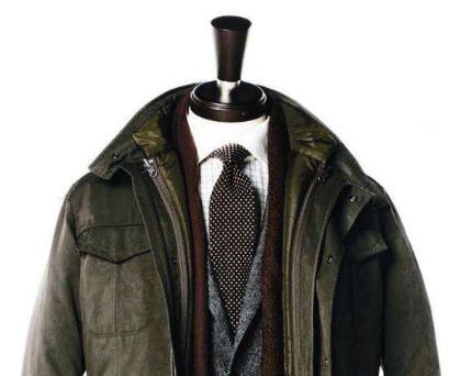 - Drab olive green, military-inspired, field jacket with removable down vest.