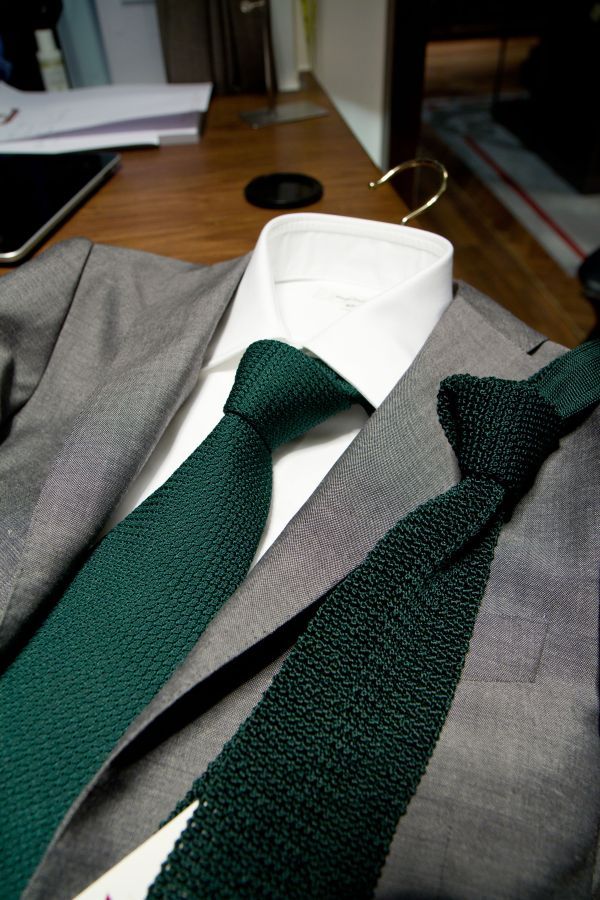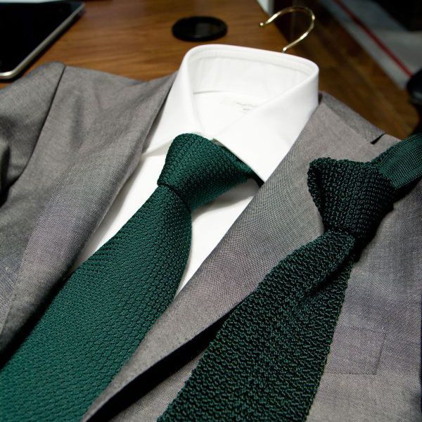 Unfortunately, most men don’t have any green ties. If you’re just getting your first, start with the basics – grenadines and knits. On the high end, there is Drakes of London’s kelly green grenadines and tartan green knits. Those will be some of the best on the market, but at $150, not everyone can spare the money. Much more affordable are Sam Hober’s green grenadines, which he has in four different shades, and come in garza grossa and garza fina. The difference between the two varieties is in how evident the weaving is; garza grossa is bigger and garza fina is finer. I have a strong preference for garza grossa, but it’s a matter of preference. Hober’s ties are custom made and cost $80. The quality is remarkable and gives up nothing to other high-end labels. In fact, as you can see from this picture, Hober’s ties are often better than some of luxury-end ties. While both are handmade, Hober’s looks more cleanly made while the Borrelli has a bit of crinkling at the tip.