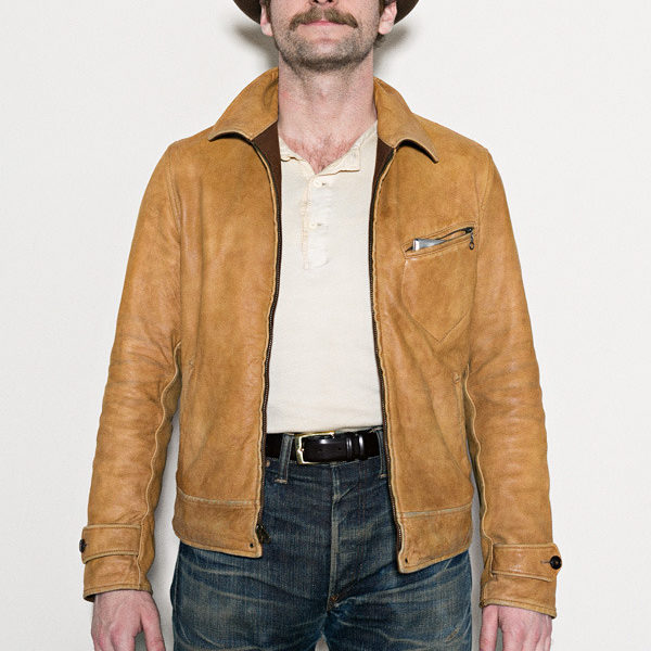 - David Himel’s “grizzly” jacket, a popular 1930s motorcycle style named for its combination of heavy horsehide and mouton. David’s jacket has tuck-away pockets and a rounded Cossack-style collar (you can see another photo of it here). Presumably available as a custom order through his company Himel Brothers, although a similar style can also be had through Aero.