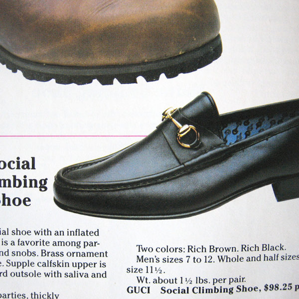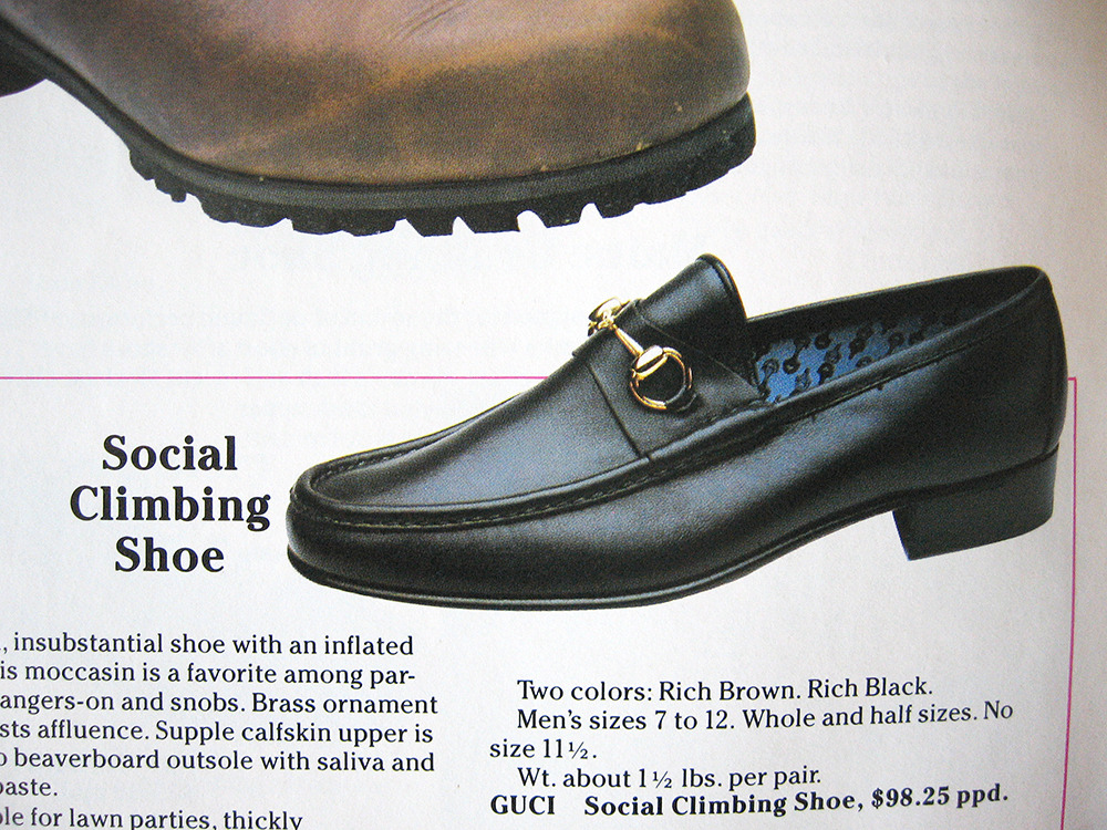 - Social Climbing Shoe: A slim, insubstantial shoe with inflated price, this moccasin is a favorite among parvenus, hanger-ons, and snobs. Brass ornament broadcasts affluence. Supple calfskin upper is joined to beaverboard outsole with saliva and library paste. Suitable for lawn parties, thickly carpeted restaurants, or putting feet up where they can be seen. Two colors: Rich Brown. Rick Black.