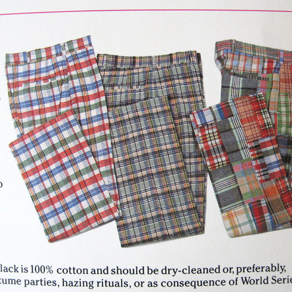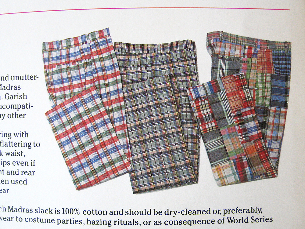 - Jackass Slacks: Comfortable, light in weight, and unutterably hideous. Authentic Indian Madras fabric is 90% handwoven cotton. Garish plaids are made up of virulent, incompatible colors. Unlikely to go with any other items in wardrobe. In this fabric, traditional tailoring with regular rise and straight leg is unflattering to all body types. Accentuates thick waist, pear-shaped bottom, and wide hips even if wearer does not have them. Front and rear pockets bulge unattractively when used (Women’s Slack does not have rear pocket). Hand Wash. Nonbleeding. Patch Madras is 100% cotton and should be dry-cleaned or, preferably, buried. Slacks are suitable for wear to costume parties, hazing rituals, or as a consequence of World Series bet loss. Three offensive Madras patterns: Nauseating Navy and Red. Nauseating Navy and Green. Putrescent Patch Madras.