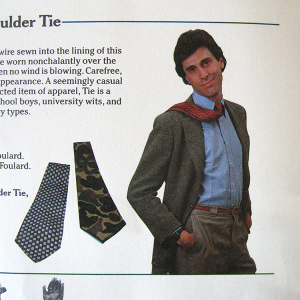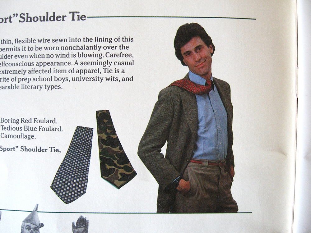 - “Old Sport” Shoulder Tie: A thin, flexible wire sewn into the lining of this tie permits it to be worn nonchalantly over the shoulder even when no wind is blowing. Carefree, unselfconscious appearance. A seemingly casual yet extremely affected piece of apparel, this tie is a favorite of prep school boys, university wits, and unbearable literary types. Three patterns: Boring Red Foulard; Tedious Blue Foulard; Camouflage.