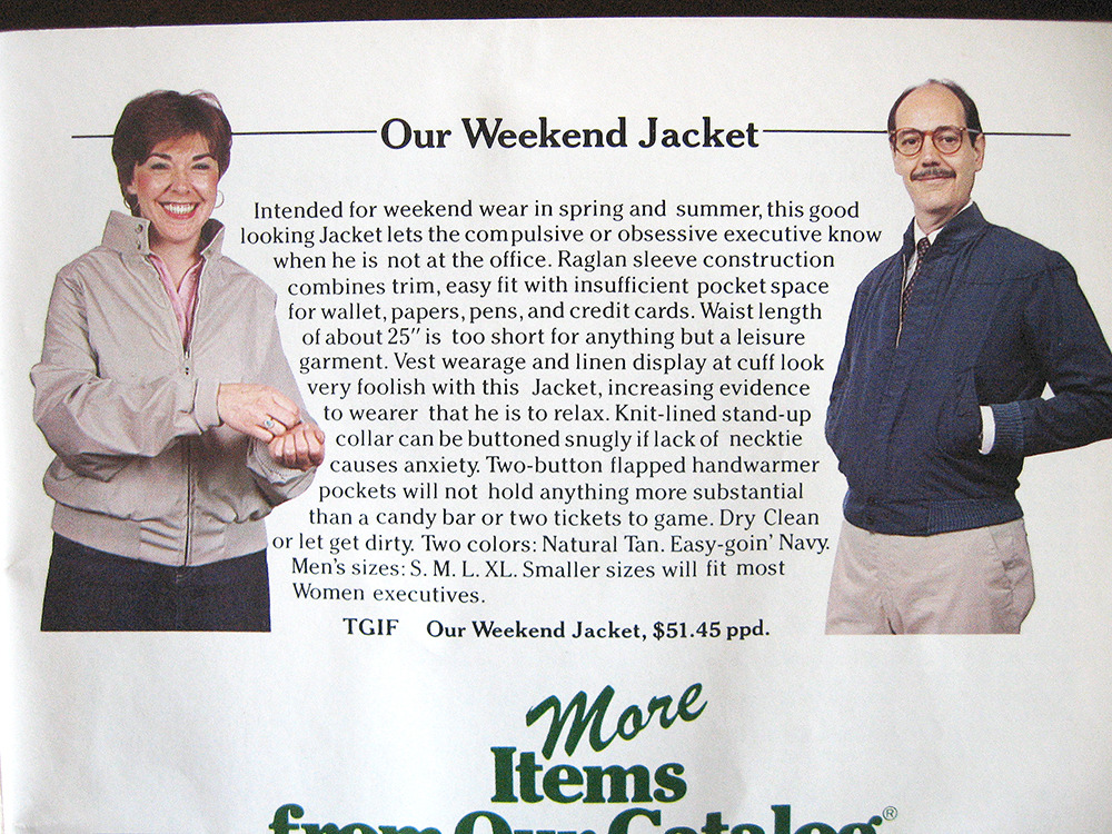 In the 1980s, at the height of the American catalog business, Alfred Gingold wrote two parody catalogs that looked much like LL Bean’s. The covers had those softly painted pictures idealizing Maine hunting life, and the inside was filled with descriptions of preppy clothes and outdoor gear. He even wrote some testimonials, just like you’d expect to find in a mail order catalog. (One was from a reclusive bachelor who liked to order and return the same things every month, just for the sake of human contact).