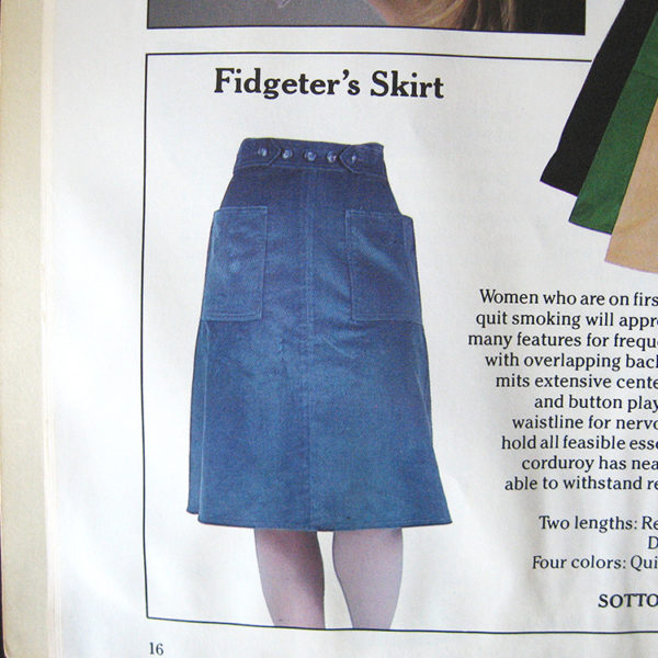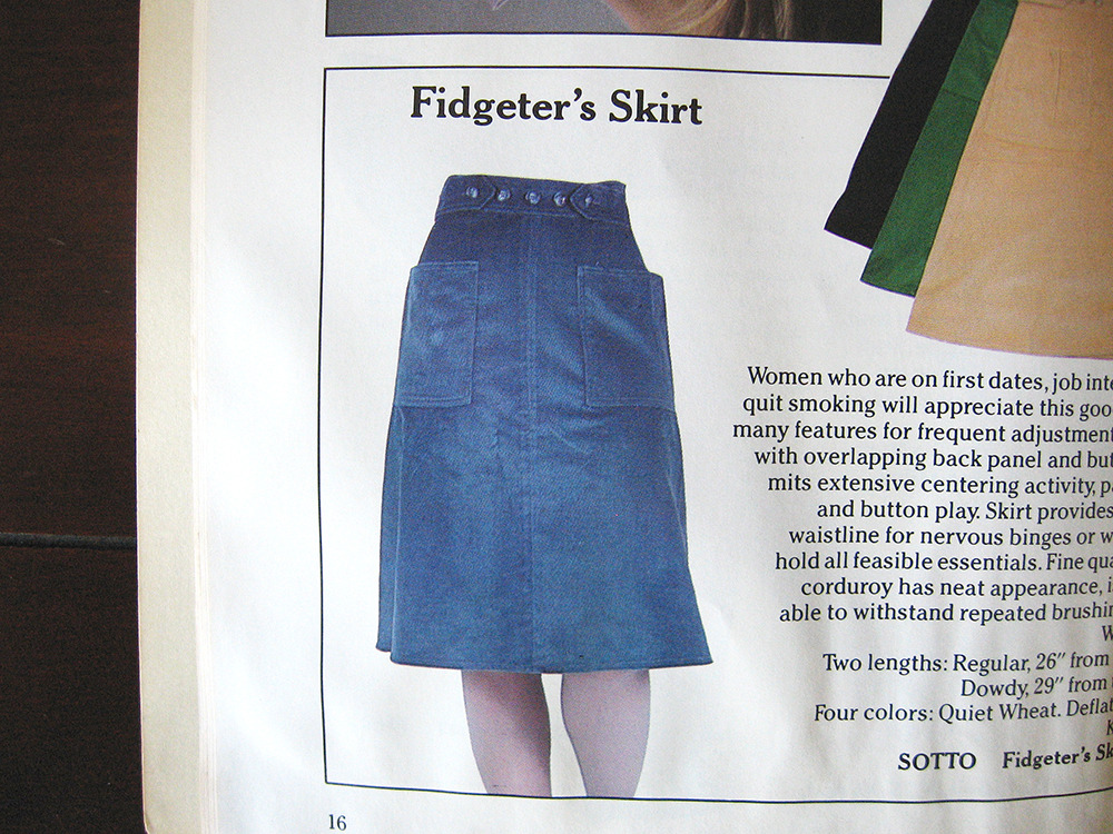 - Fidgeter’s Skirt: Women who are on first dates, job interviews, or trying to quit smoking will appreciate this good looking skirt with many features for frequent adjustment. Wraparound style with overlapping back panel and button waistband permits extensive centering activity, panel straightenage, and button play. Skirt provides 8” beyond normal waistline for nervous binges or wind. Patch pockets hold all feasible essentials. Fine quality, medium-wale corduroy has neat appearance, is comfortable and able to withstand repeated brushing and smoothing.