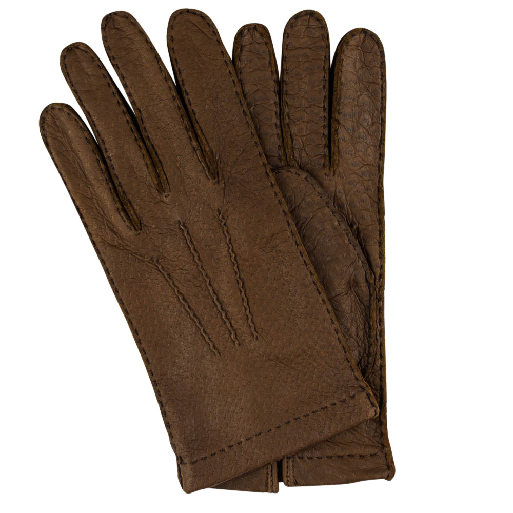 - Gloves from Thomas Riemer and Merola. Textured leathers, such as peccary and carpincho, go especially well with tweeds.