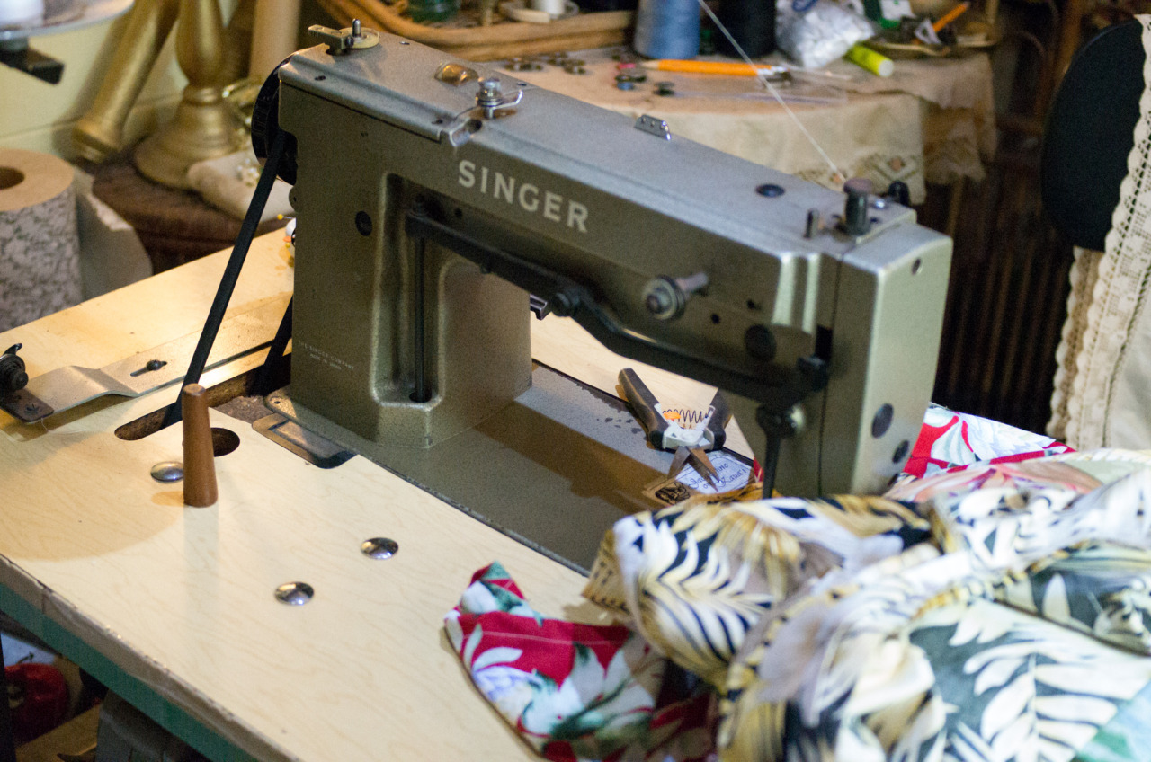 She’s got deals with the fabric stores on the island – she’ll give you ten bucks off if you bring in your own textile. Her own selection tends towards the touristy, though thankfully it’s all cotton (she abhors polyester and longs for the days when she could get good rayon). She needs about three yards for the shirt – sometimes three and a half if the pattern’s long, since she insists on matching the pocket.