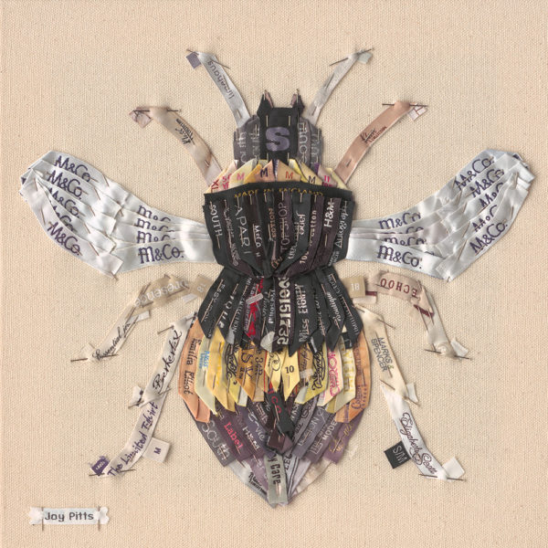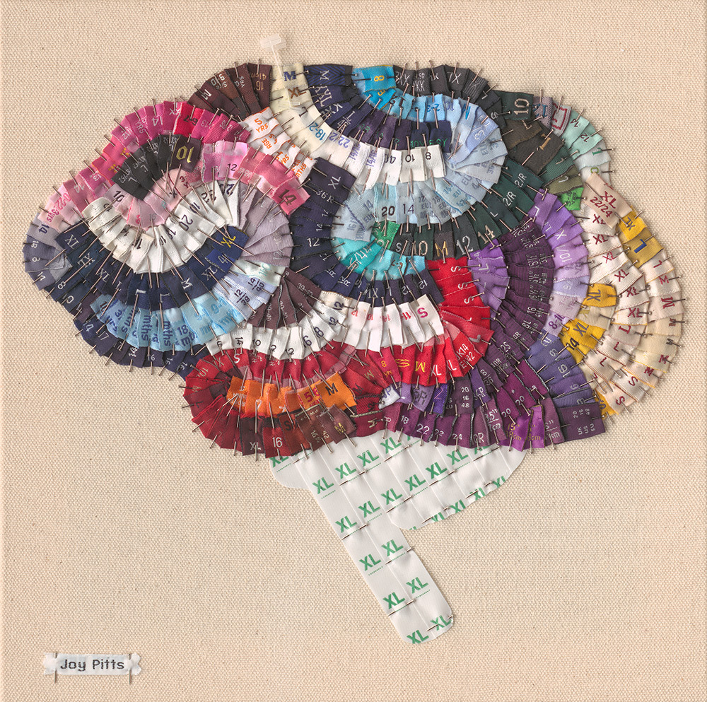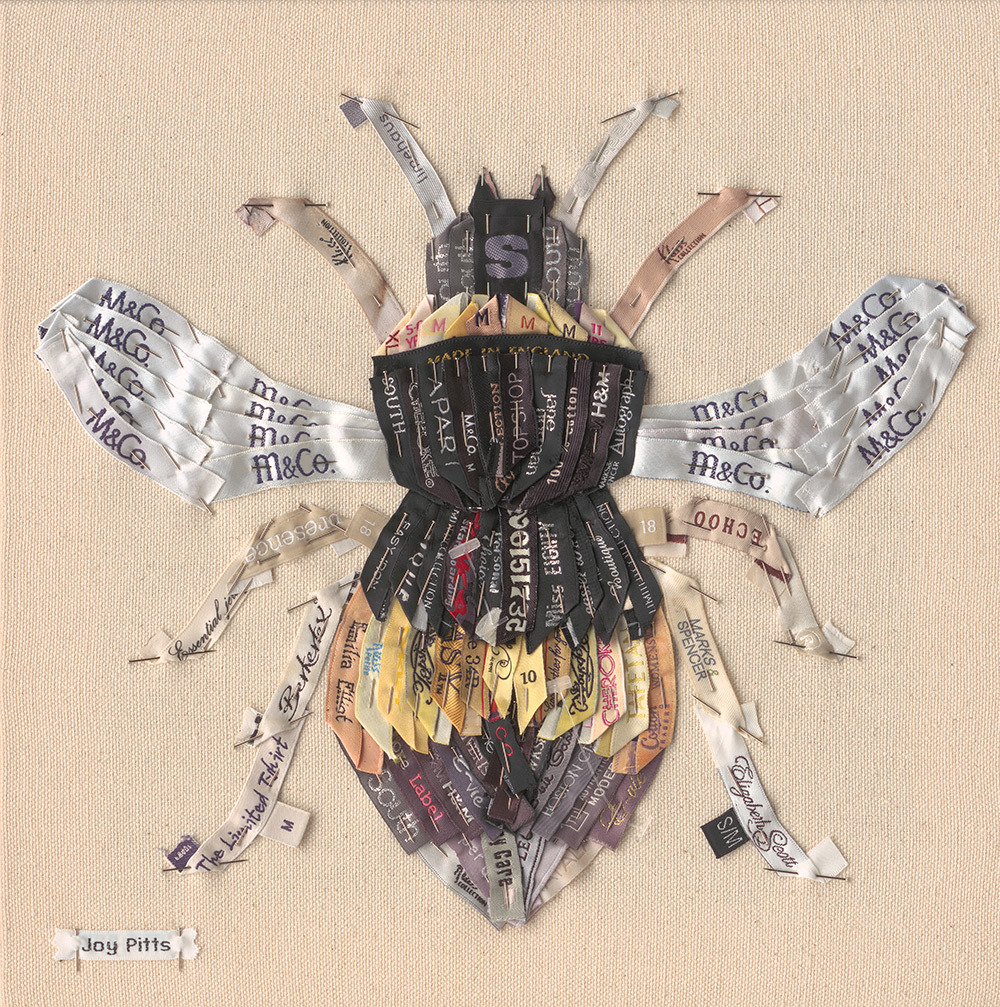 Some people resist labeling, but Joy Pitts has made a career out of it. The British artist recycles clothing labels – often collected from charity shops that would otherwise turn them into rags – and transforms them into brilliant works of art. Each piece is made by pinning individual labels against a canvas, using dressmaker pins, until they form a greater image. We recently talked with Joy about her work: