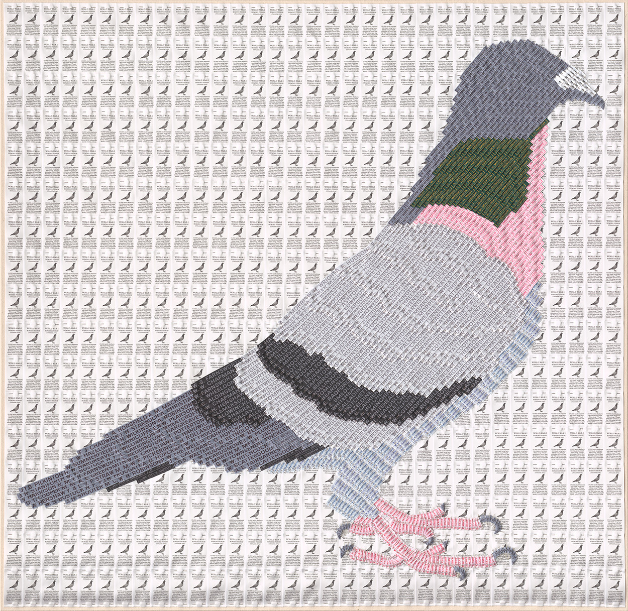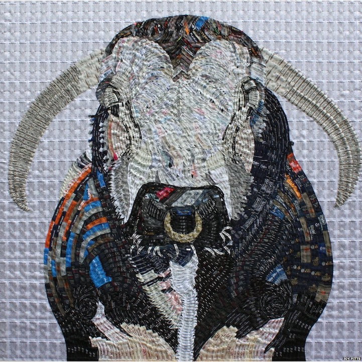 Contextual information lies with the detail of each piece, which I consider to be an essential element of my finished work. For example, the Queen is dedicated to our armed forces and I’ve assembled her portrait using names of those fallen in WWI. The swan has connections to beauty – the ugly duckling and Swan Lake. This reflects our desire to look good through the garments that we choose. Even the Longhorn Bull is bred for his good looks and ability to win prizes in the show rink. In fact, his whole life is focused around his image.