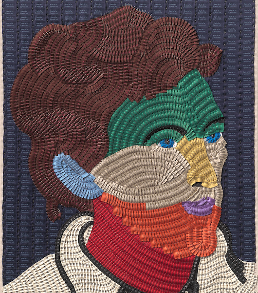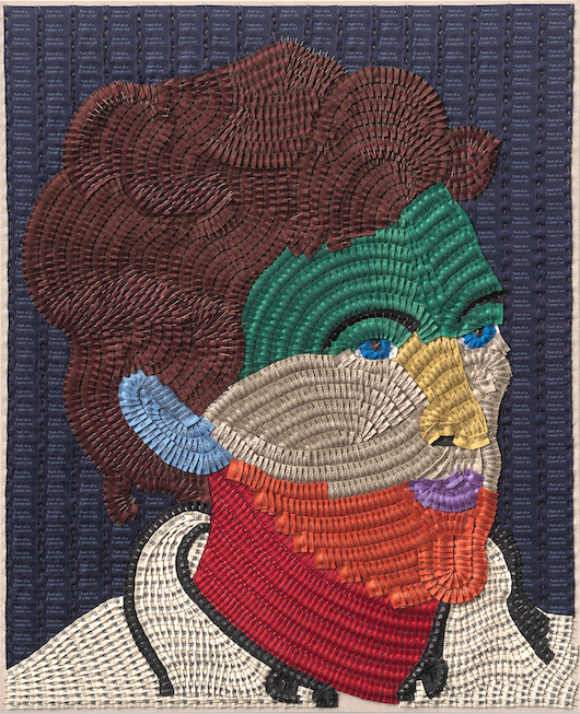 I also make work from woven name tapes, such as the recent portrait of Her Majesty, and design my own labels for specific projects (such as this work titled “Jane”). For this piece on military boots, I invited 520 military servicemen and women to send in their name tapes. At this point, sometimes individuals and brands will also send me labels.