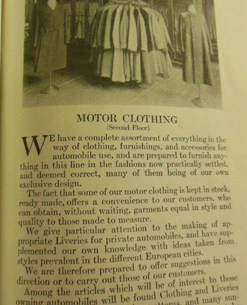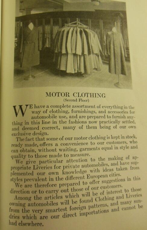 Anyway, the second photo is of a Brooks Brothers store in 1915. Apparently the second floor was used for their “motor clothing department” (clothes to be worn on motorcycles or open-top unheated cars).The first paragraph reads: