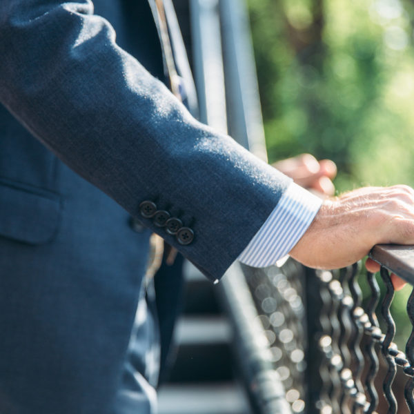 The suit is made from an English fabric, a high-twist wool, and there’s something humble about it. You touch it and your first thought isn’t “woah, this is luxurious.” It’s almost plain, actually – coarse and hefty, with an openness to the weave. It’s what we call a mélange yarn, which means there are multiple colors in the mix. So instead of matching everything you’re wearing to one color, you’ve got a little more to work with. It’s a little like denim in that sense – it goes with everything, but elegantly and without any fuss.