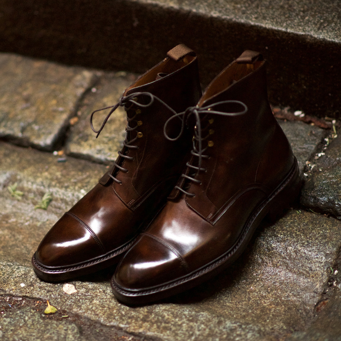 They also have three construction methods: Blake stitched (their most affordable); Goodyear welted (what Skoak carries); and something they call “handcrafated” (which is their most expensive at $800/ pair). From specs, the Goodyear line sounds pretty solid. The uppers are made from full grain leathers sourced from reputable tanneries such as D’Annonay; the insoles and heels are made from regular leather (not fiberboard); and the soles are slightly beveled (a nice detail typically found on more expensive footwear). Skoak also offers a custom patina service on uncolored crust leathers for those who want to get something in a very specific shade of brown – or, if you’re more daring, a more unusual color.