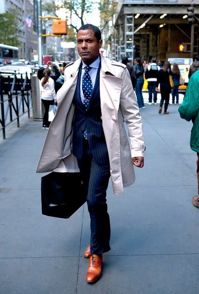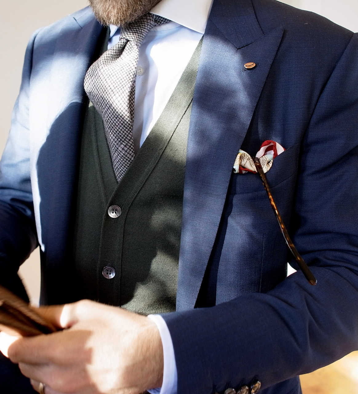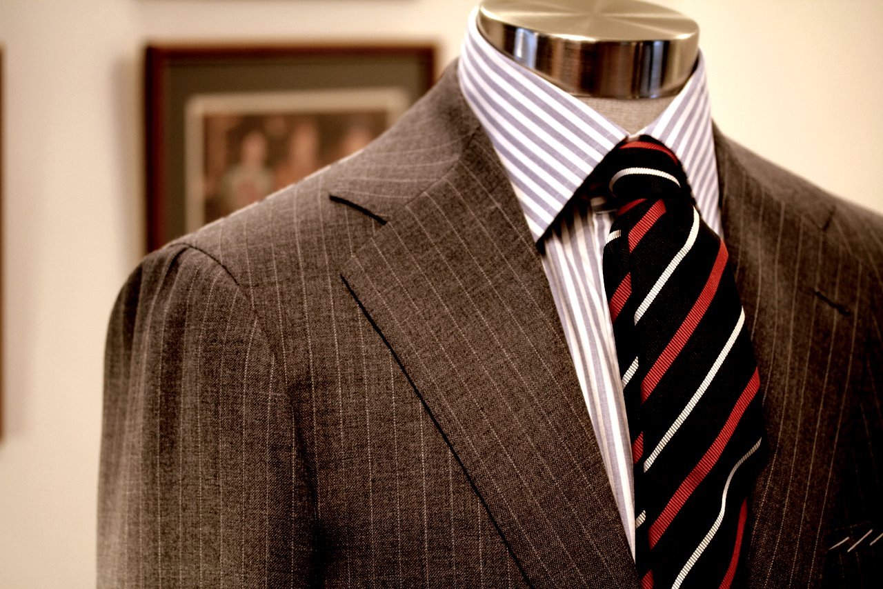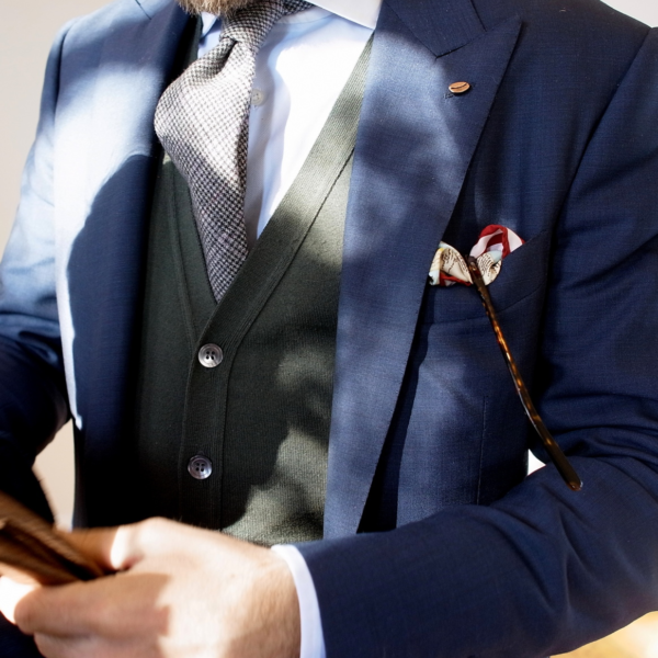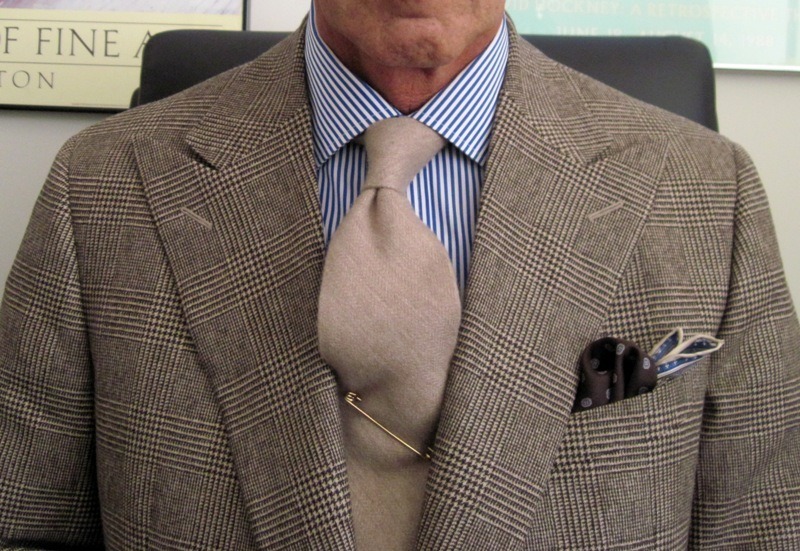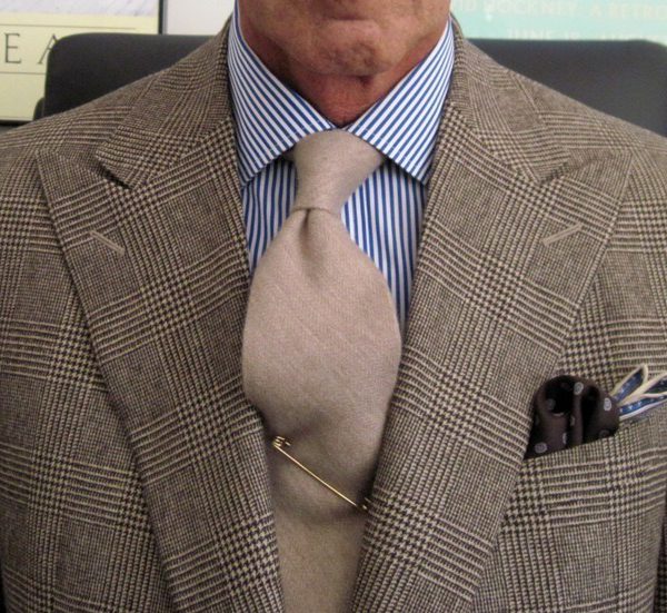 I think there are other dimensions that are worth striking a contrast. A textured tie such as a woven grenadine or silk knit can sit well against the flatness of poplin or smoothness of gabardine. Likewise, a man should consider how he balances between the shine and dullness of his clothes. A lustrous silk tie looks good next to a dry linen pocket square, and a tie in a duller fabric, such as wool or cotton, is perfectly complemented by a shiny pocket square in a printed solid or foulard. Similarly, the gleam of a man’s tie or well polished shoes can act as a good counterbalance to his otherwise matte ensemble.