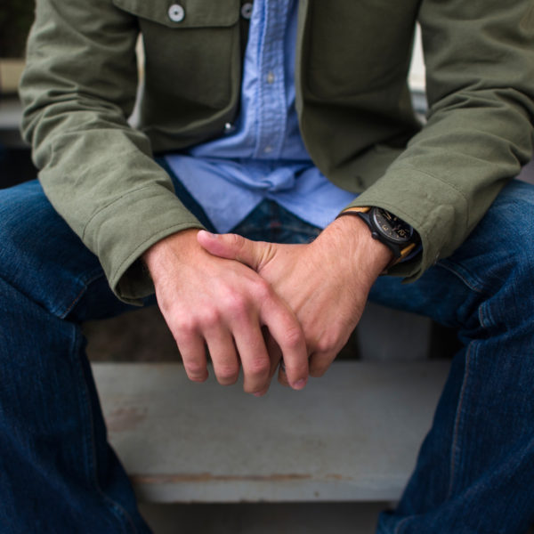 - Army green chore coat, chambray, and jeans by Gustin.