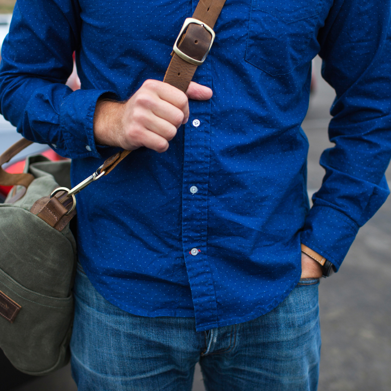 - Dotted shirt, jeans, and waxed cotton duffle bag by Gustin