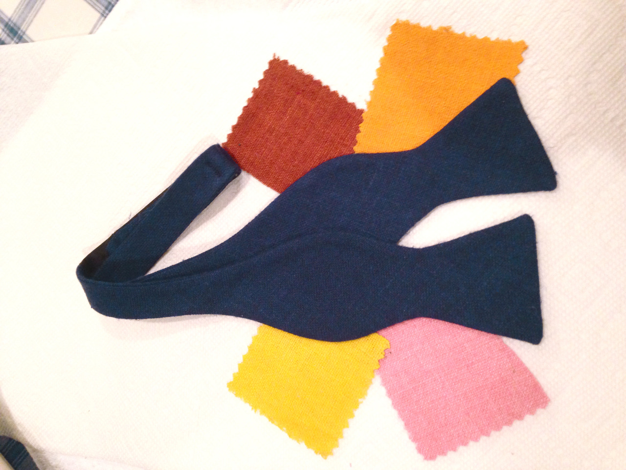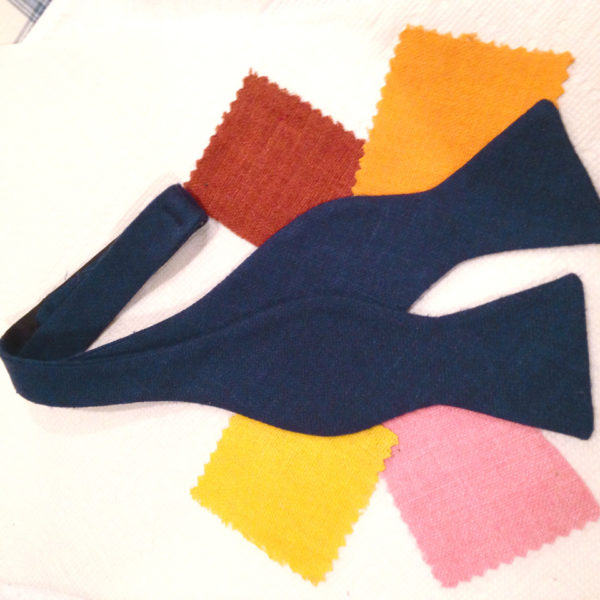- Chipp’s Matka cloth navy bow tie, along with four swatches. Four-in-hand styles also available, along with more colors. Contact Chipp for info.