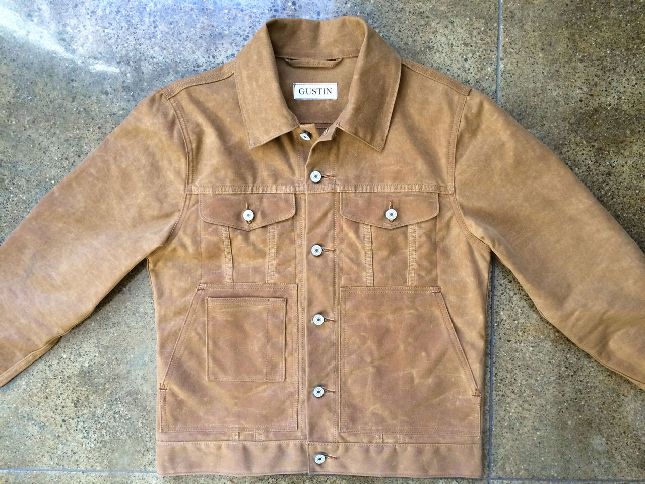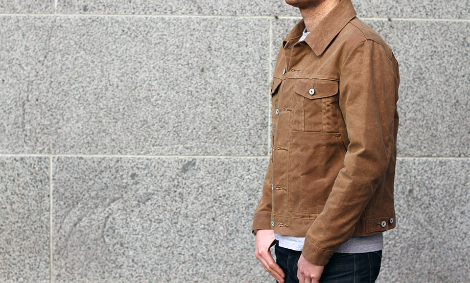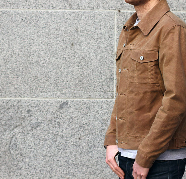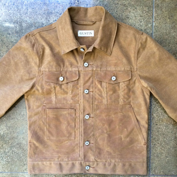 - Waxed cotton trucker jacket, from the first run at Gustin