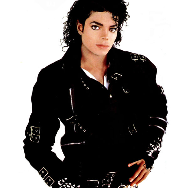 Michael Jackson’s personally owned and worn “Bad” jacket, made as a prototype for his iconic video and cover for the album. A follow-up to smash hit “Thriller”, the record-setting “Bad” album produced more Billboard Hot 100 #1 singles than any other. Design of the final incarnation of the jacket departs only slightly from this prototype, featuring more metal embellishments overall. Custom black jacket in heavy denim features an asymmetrical design, with double zip front set on a diagonal. With studded collar, lace-up sides and belts on the sleeves. The right sleeve is wrapped with four nylon belts outfitted with silver tone metal buckles, spaced evenly along the center of the sleeve. Left sleeve features three belts set on a diagonal with a zipper between the first and second belt. Jacket is in fine condition.