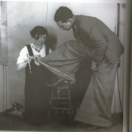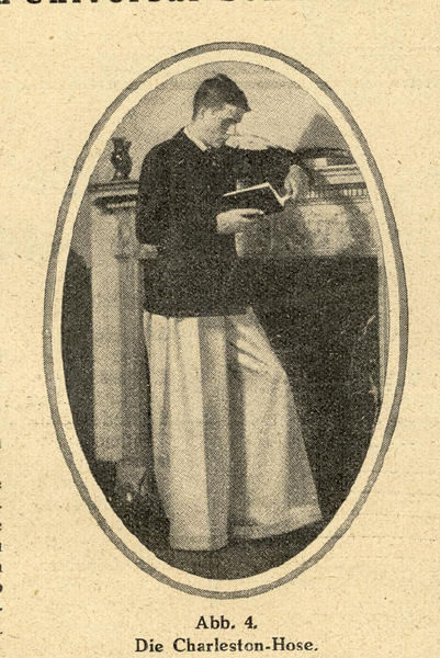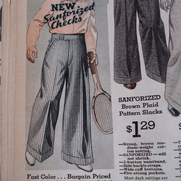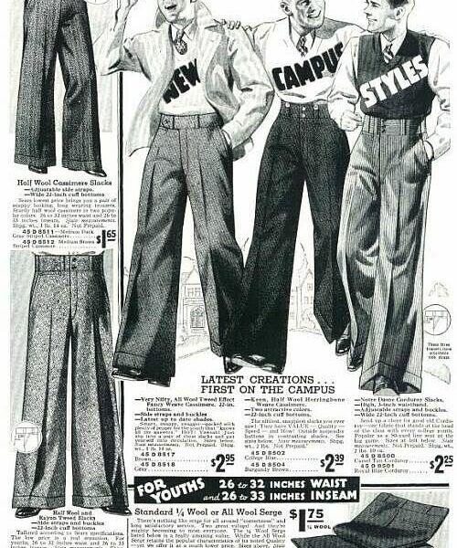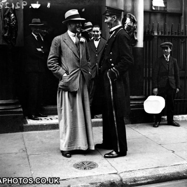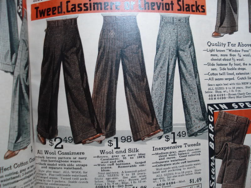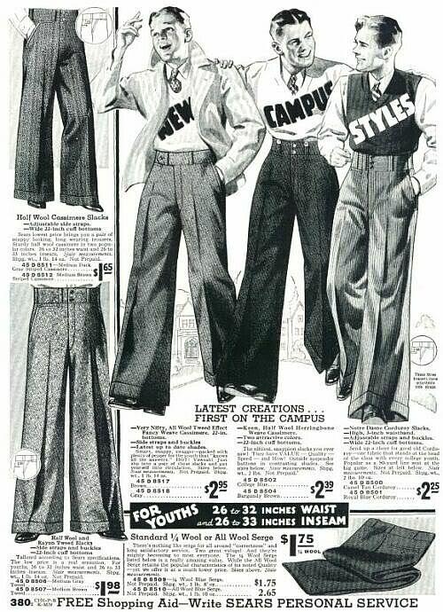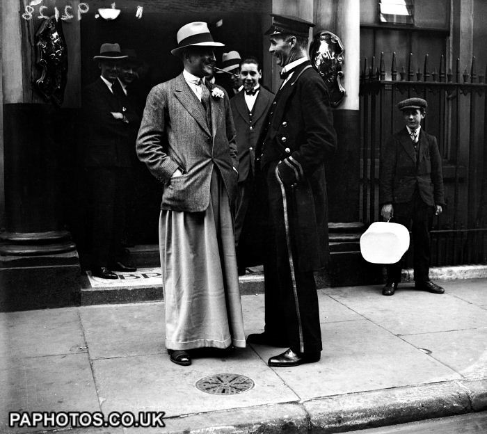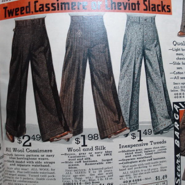Yesterday’s post on fashion cycles reminded me that I have these photos sitting on my computer. These are “oxford bags” – a style of ridiculously baggy trousers that was popular in the early 20th century. They were often made of flannel wool, and originated with undergraduate students at Oxford University (hence the name). At the peak of their popularity in 1925, the bottom hem of men’s pant legs was almost always under 20 inches in circumference. (For reference, most “fashionable” trousers today have a circumference of 16 to 18 inches for suits, and maybe 15 to 17 inches for odd trousers). Oxford bags, in contrast, sometimes measured 40 inches or more.