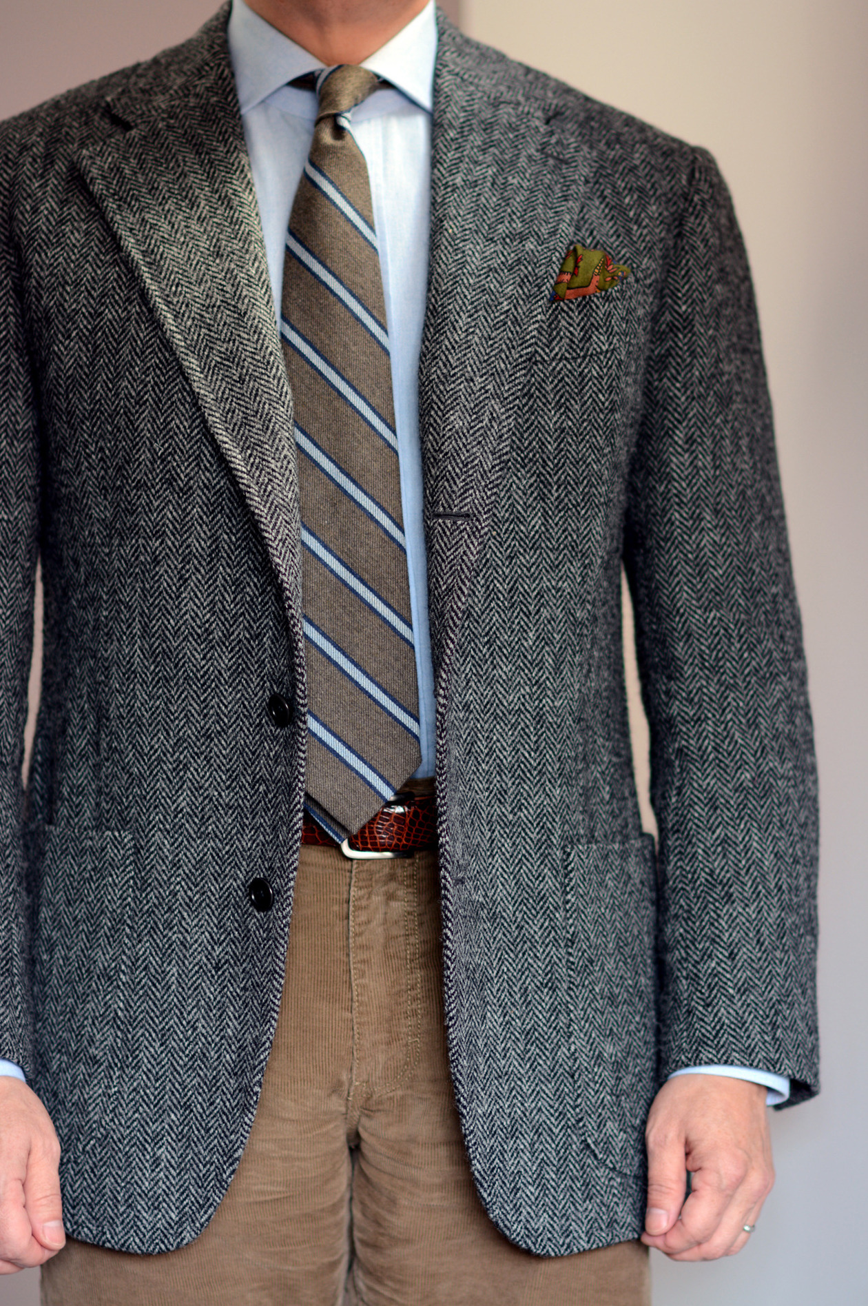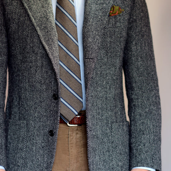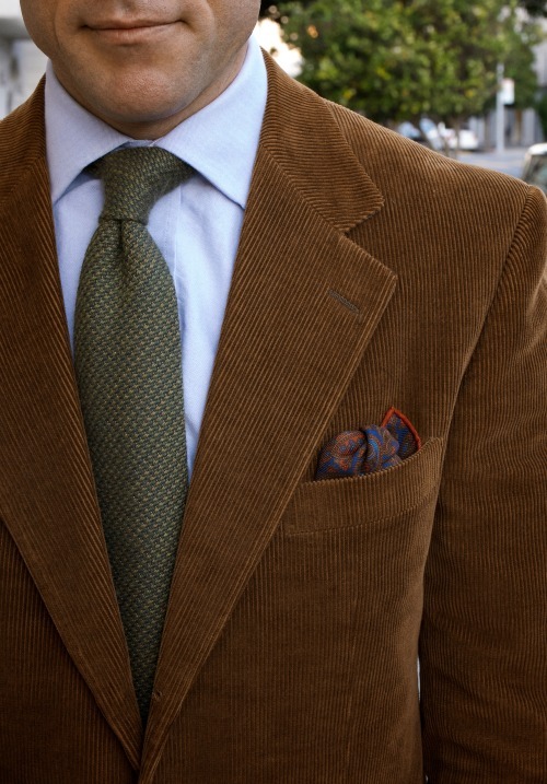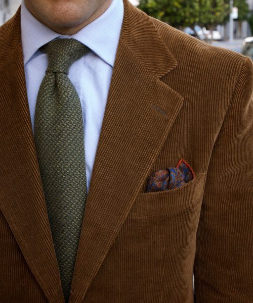 Corduroy also plays well with denim, which makes it a great option if you like dressing down your tailored jackets. Andy Spade, co-founder of Kate Spade along with other companies, has built his style around this combination – green, tan, and dark brown sport coats, cut a little full for comfort, but also a touch short to make the silhouettes feel casual. He usually wears them with beat-up blue jeans and similarly old chukka boots (often desert boots, such as Loake’s Sahara or Clark’s). You can accessorize this look with a pocket square, but I find jeans + sport coat combos look best without a tie (it keeps things casual).