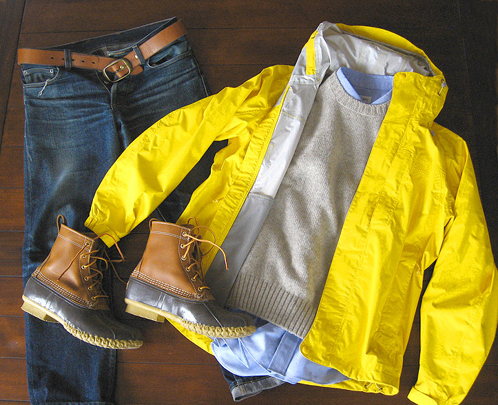 Along with the DIY durable-water-repellant spray we mentioned in Monday’s post, you can check out LL Bean’s no frills Trail Jacket for an affordable solution. It’s made from a ripstop nylon, comes with a hood, and is available in a bunch of playful colors (nice when the weather is gloomy). The fabric here isn’t anything special – it’s somewhat stiff and rustles easily, and the Velcro closures aren’t that comfortable – but it’s also not something you have to baby. And for the time being, LL Bean’s lifetime satisfaction guarantee is hard to beat. I wear the yellow one on occasion with Shetland sweaters, OCBDs, and jeans. Just be sure to size down if you want a slimmer fit.