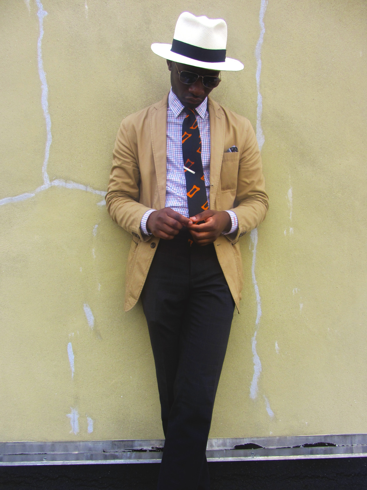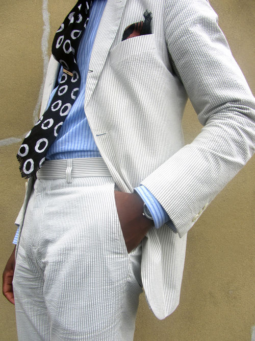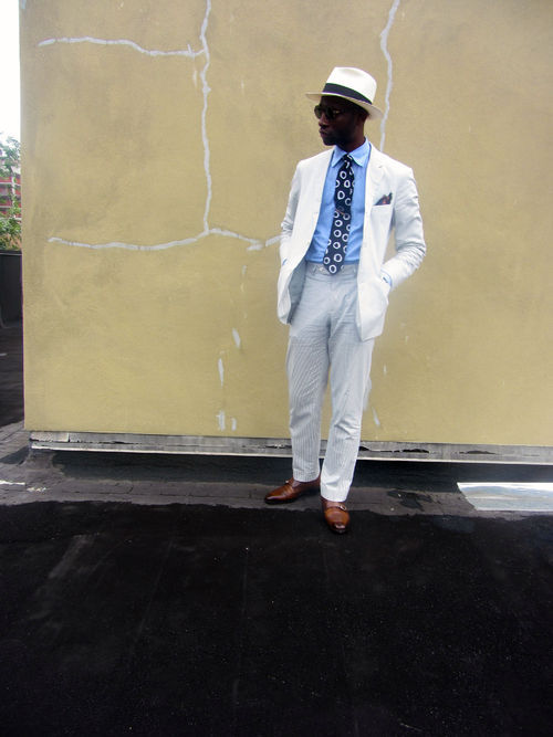 Pictured above are two of his recent summer ensembles. The first combines charcoal trousers with a tan sport coat (the best combination for charcoal trousers, in my opinion), and plays a bit with proportions. The jacket’s gorge is higher, lapels narrower, and collar points shorter. I’d normally think such proportions look affected on most guys, but Niyi carries it off here exceptionally well. I also like the soft fit of the jacket along the shoulder line, and think it helps him look natural and relaxed.