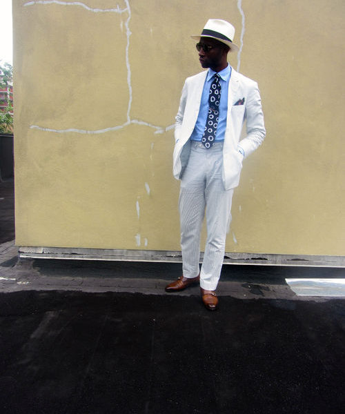 The second ensemble is deceptively more complicated than it seems. Here, Niyi is mixing four patterns without any of them clashing. There are the narrow stripes on the suit, the wider stripes on the shirt, the boldly patterned tie, and the complementary (but not matching) patterned pocket square. To go with the summery shirt and suit, he’s picked chestnut shoes instead of your regular dark brown. I think it looks fantastic.