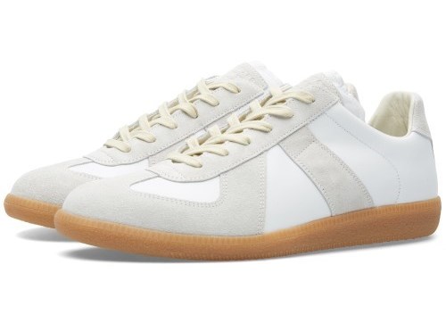 These days, with all white Stan Smiths and similar designs dominant, almost everyone looks pretty fast. Whether they’re classic Chucks or something retrofuturistic like Nike Sock Darts, I wear primarily white, light gray, or otherwise light sneakers, in part because I wear dark blue or black denim casually and I like the contrast between my pants and shoes. Maxime in Paris, above left, wears white Margiela replica German Army Trainers with black trousers and a leather jacket for a minimal but elegant combination. I hate to say “you can’t go wrong” with black leather jacket, white shirt, black jeans, and white sneakers, but if you’re going to pick a casual uniform it’s a sharp one. I suppose it also helps if you’re in Paris. I also like pairing sand suede chukkas with indigo denim jeans, or, on the other end of the contrast spectrum, light wash jeans and black boots.