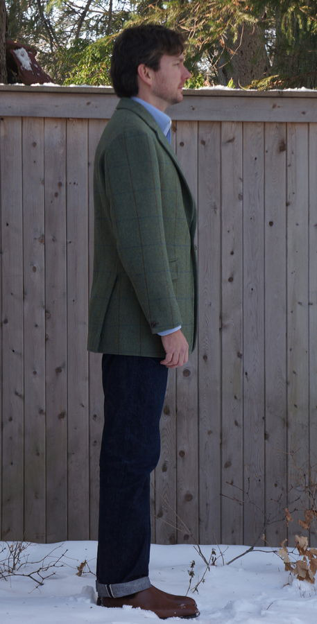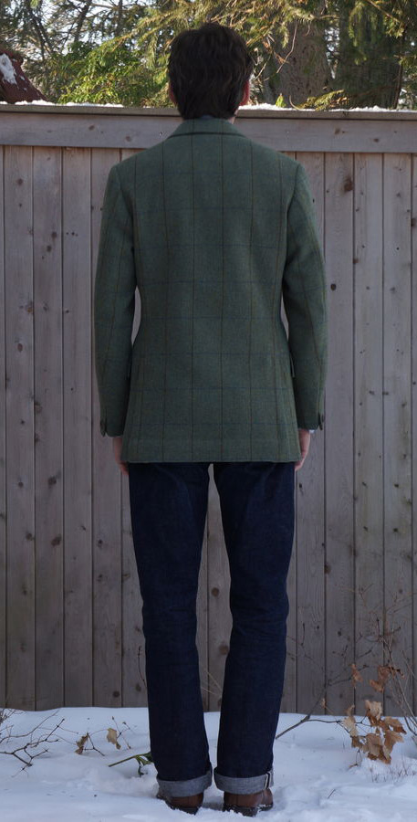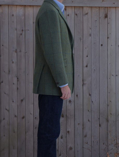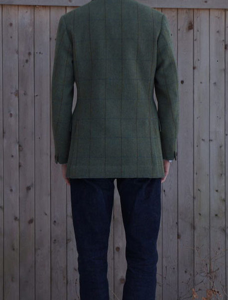 It’s difficult to tell from the photo, but the cloth is woven with a unique combination of both herringbone and barleycorn patterns, giving it a very interesting and classic look. There’s also a blue and chestnut overcheck, which you can faintly make out in the photos. David chose some really tasteful and original details, such as the one button front and single button sleeves. Most sport coats have three or four buttons at the sleeves, while a single button is more of an old-school casual/ sporting detail, particularly found in Southern Italy. The soft shoulder construction and slightly full chest and upper back are signatures in a Steed jacket, and I think it fits David’s style excellently.
