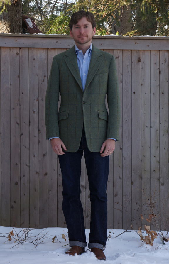Tweeds and jeans go well together because of their equally casual nature and rustic background. With anything too smooth or slick – either in texture or sensibility – you run the risk of looking strangely dressy up top and too casual down bottom. The most obvious faux pas is to wear a suit jacket with jeans, but even as you go down the scale in formality, the combination can look very odd. A tweed sport coat with a pair of jeans, with an equally casual, blue button-down collar shirt (sans tie) and a pair of boots though? Excellent.