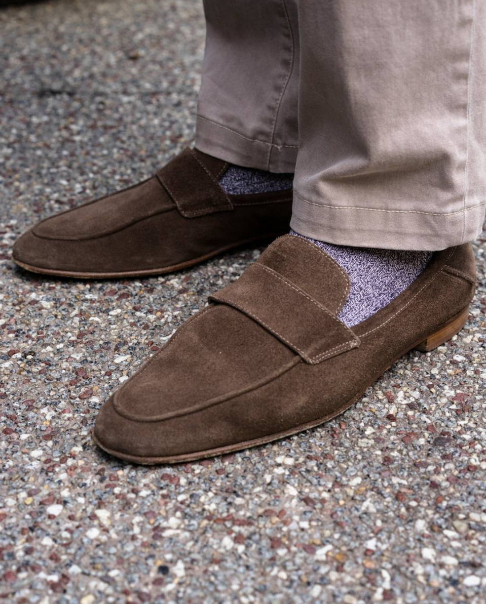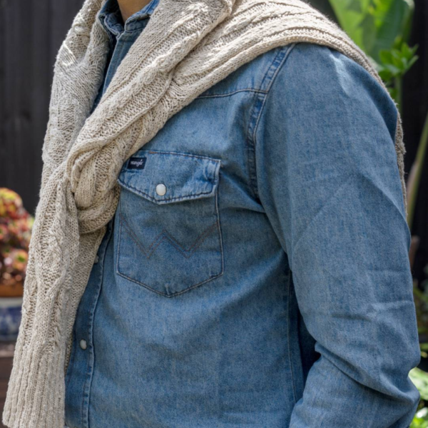 Gerry is wearing his above with slightly preppier elements – slim-cut chinos, unstructured suede penny loafers, and a cream cable knit thrown over his shoulders. I think the outfit would work equally well if you swapped out the sweater for a charcoal topcoat, or maybe change out the loafers for some boots and put on a green field jacket. Stonewashed denim shirts can be a great way to play down the formality in tailored clothing, or complement the rugged sensibility of workwear.