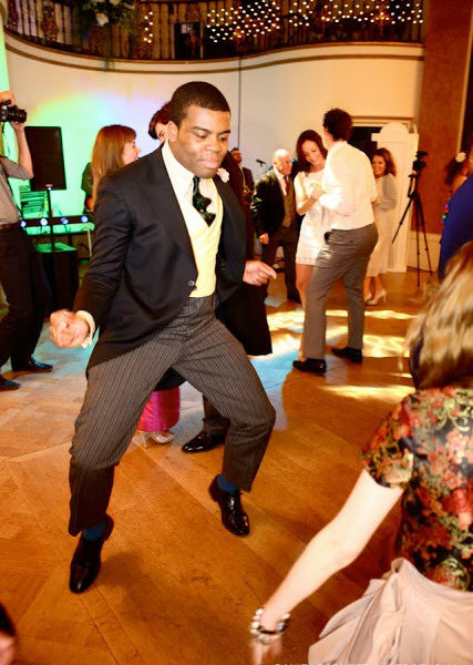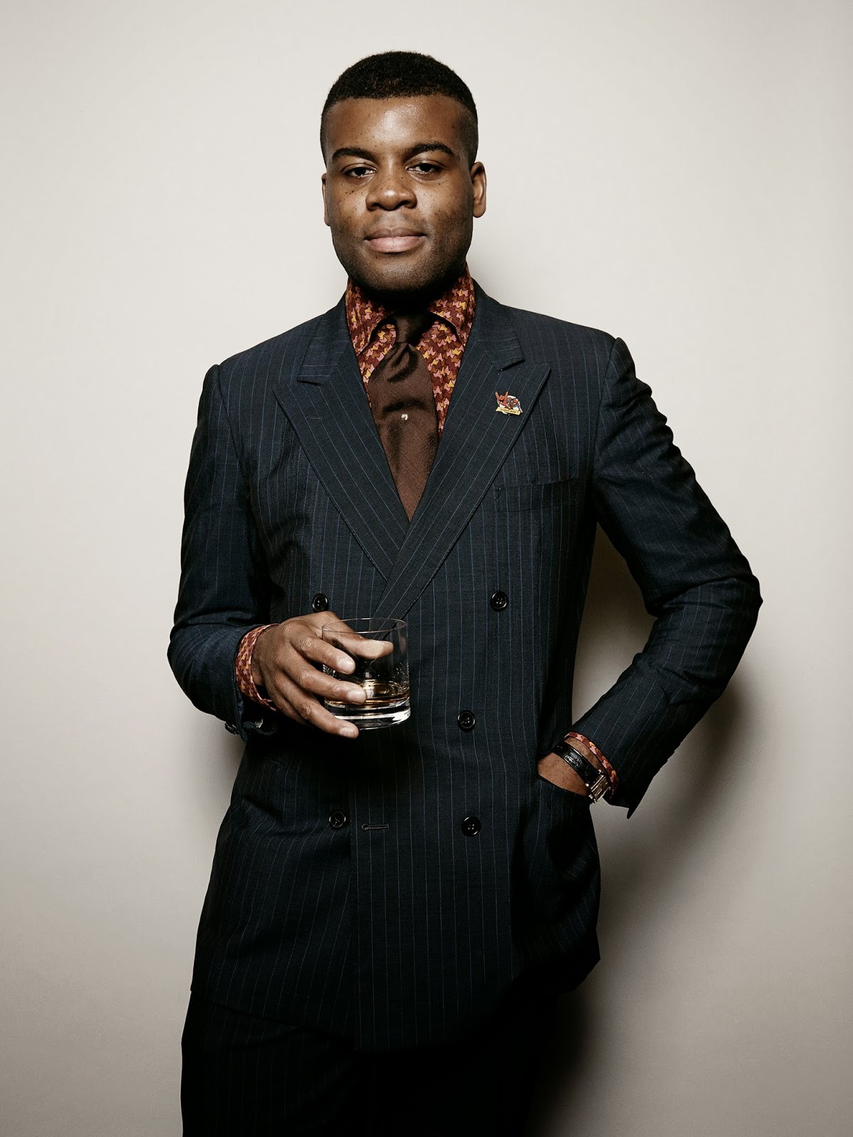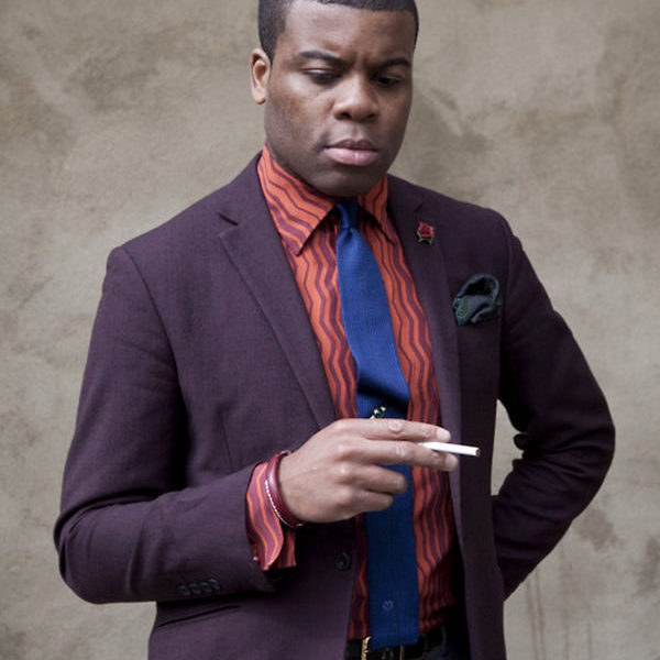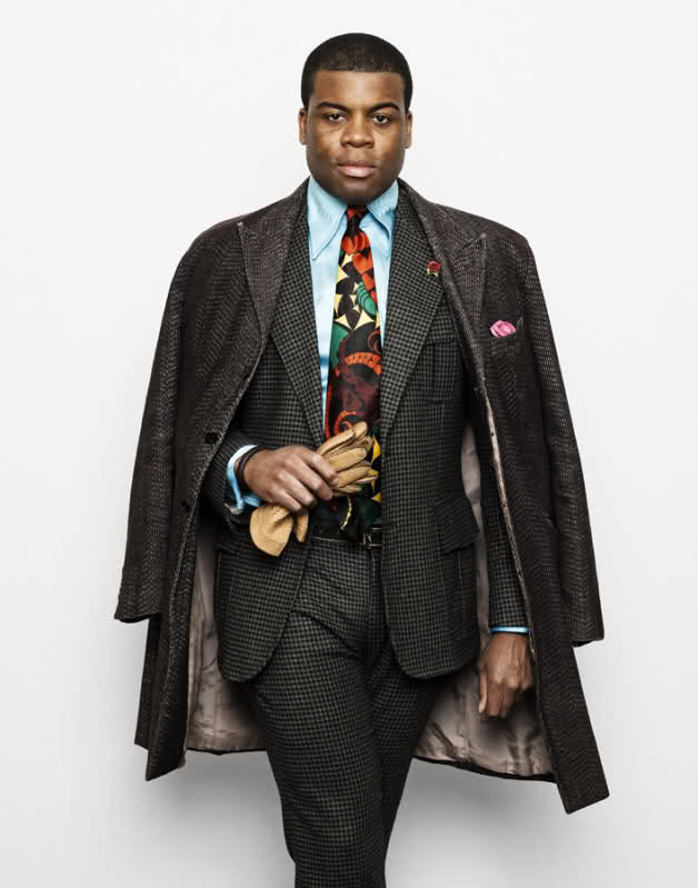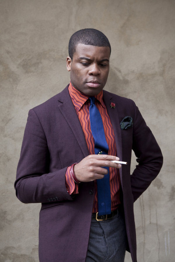 The secret to Barima’s success isn’t his wild accessories, however. It’s how he combines things. The unusual shirt and tie you see in the first photo are paired with a seemingly conservative grey suit, but when you look closely, you’ll notice that the suit itself is bold (the lapels are wide and the pockets are inspired by designs typically seen on hunting coats). On the other end, the purple sport coat has slim lapels, which Barima plays up by wearing a cobalt-blue knit tie and a groovy, zigzag shirt (making this a 1970s psychedelic version of ‘60s Mod style).