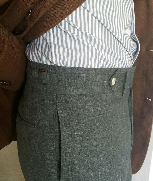 Unfortunately, although traditional jackets can still be had, higher-rise trousers are difficult to find off-the-rack. At least ones with a slim leg-line. Scott in Dallas here is wearing the Sal model from Eidos, a relatively new company that offers a youthful take on traditional Italian style. Their Sal model combines a slim leg with a higher rise, and features nice details, such as an extended tab closure and adjustable side tabs. Scott has paired the pants with a tobacco linen, soft-shouldered sport coat and spread collar shirt from Suitsupply. The look is deceptively simple, but the striped shirt, subtly textured trousers, and brown suede shoes keep things interesting.