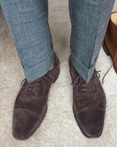 You can pick up the trousers at No Man Walks Alone (note: they use European sizes, so be sure to convert). The listed price is a bit high, but you can knock 10% off with the checkout code OCT10, and the pants come with a $40 tailoring credit, which is automatically deducted at checkout. That brings the price down to about $300 (pricey, but not too far from the ~$200 Howard Younts that are often recommended). Gentlemen’s Footwear also has the same suede Carmina shoes above on sale. Sizes are limited, but they can take special orders. For a similar sport coat, Suitsupply has this Hudson model in a wool-cashmere blend.